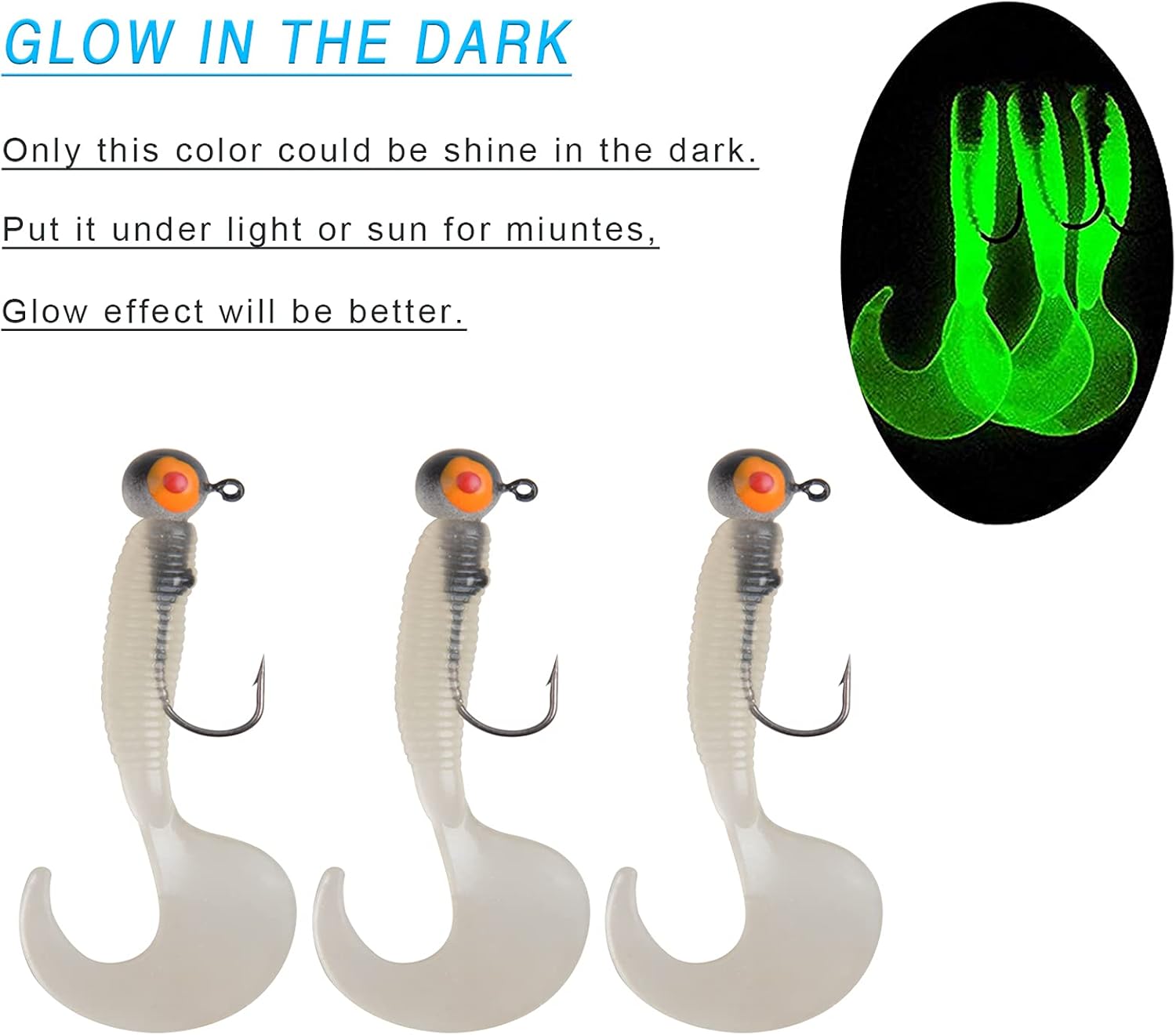 Soft Lures Fishing Jigs Kit, Worm Grub Fishing Lures Jig Head Hooks Kit Grubs Bait Jig Heads Soft Plastic Bait Crappie Jigs Tubes Baits Curved Tail Lure Fishing Lures Kit for Walleye Bass Trout