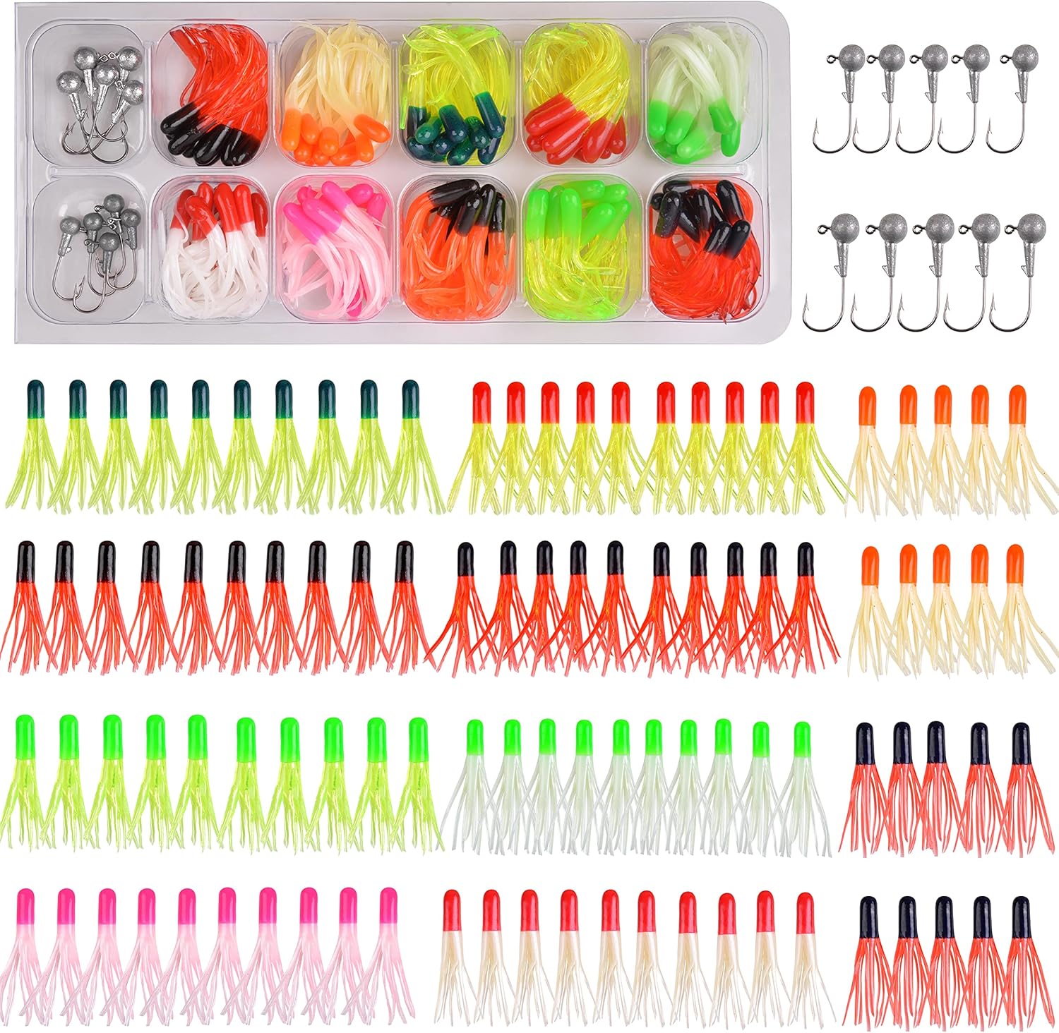 110pcs Crappie tubes baits : 100pcs crappie tubes bait (mix colors)+ 5pcs 3.3g jig heads hooks + 5pcs 1.6g jig heads hooks