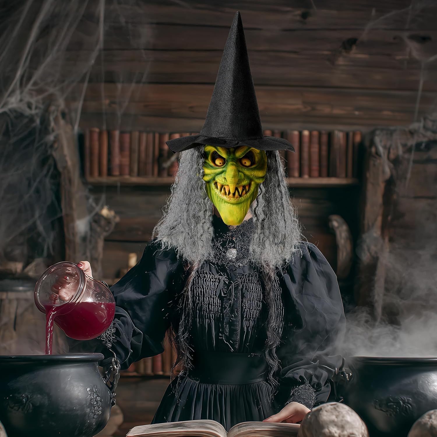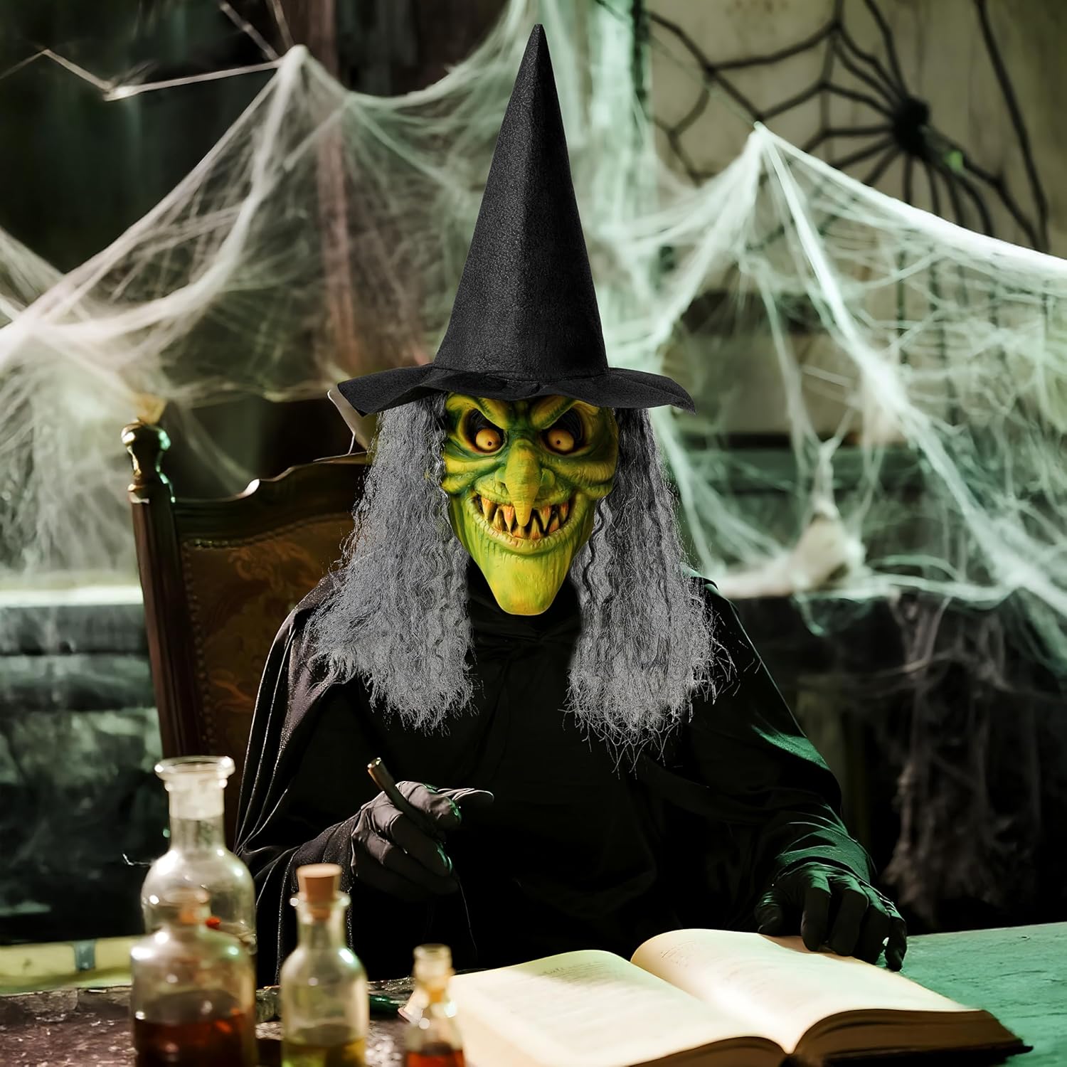 • Lifelike Design. Silver, tangled hair frames a gnarled green face, complete with a warty long nose and a fierce, unyielding glare. This scary Halloween mask captures every gruesome detail, sharp teeth, glaring eyes, cunning smile, dangerous gaze has locked onto the coward! Perfect for scary Halloween masks enthusiasts. Suitable for Halloween role-playing, increaseing a spooky atmosphere to your scary Halloween costumes.