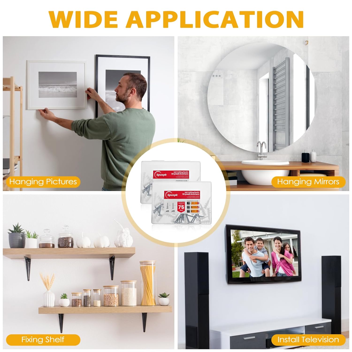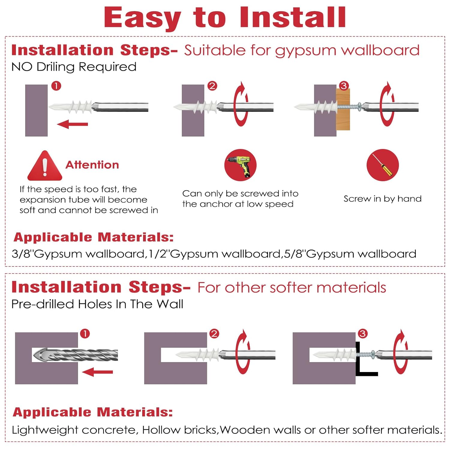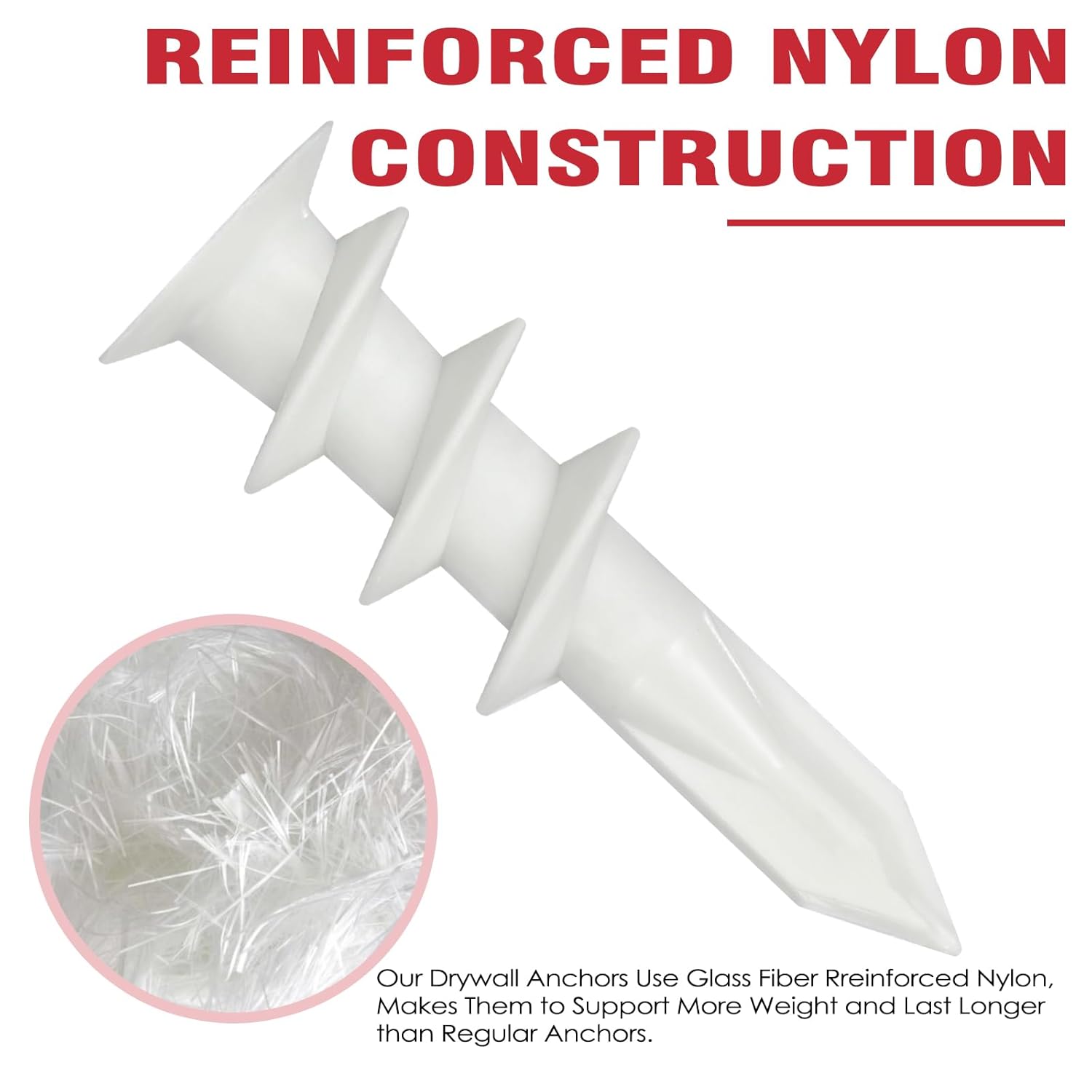 【Premium Material】These slef-drilling Drywall anchors are made of high-quality hard nylon plastic mixed with highly robust glass fibers.Compared with ordinary nylon,it has better strength,anti-aging and wear resistant.60Pcs premium galvanized Phillips screws ensures reliable installation and mounting.