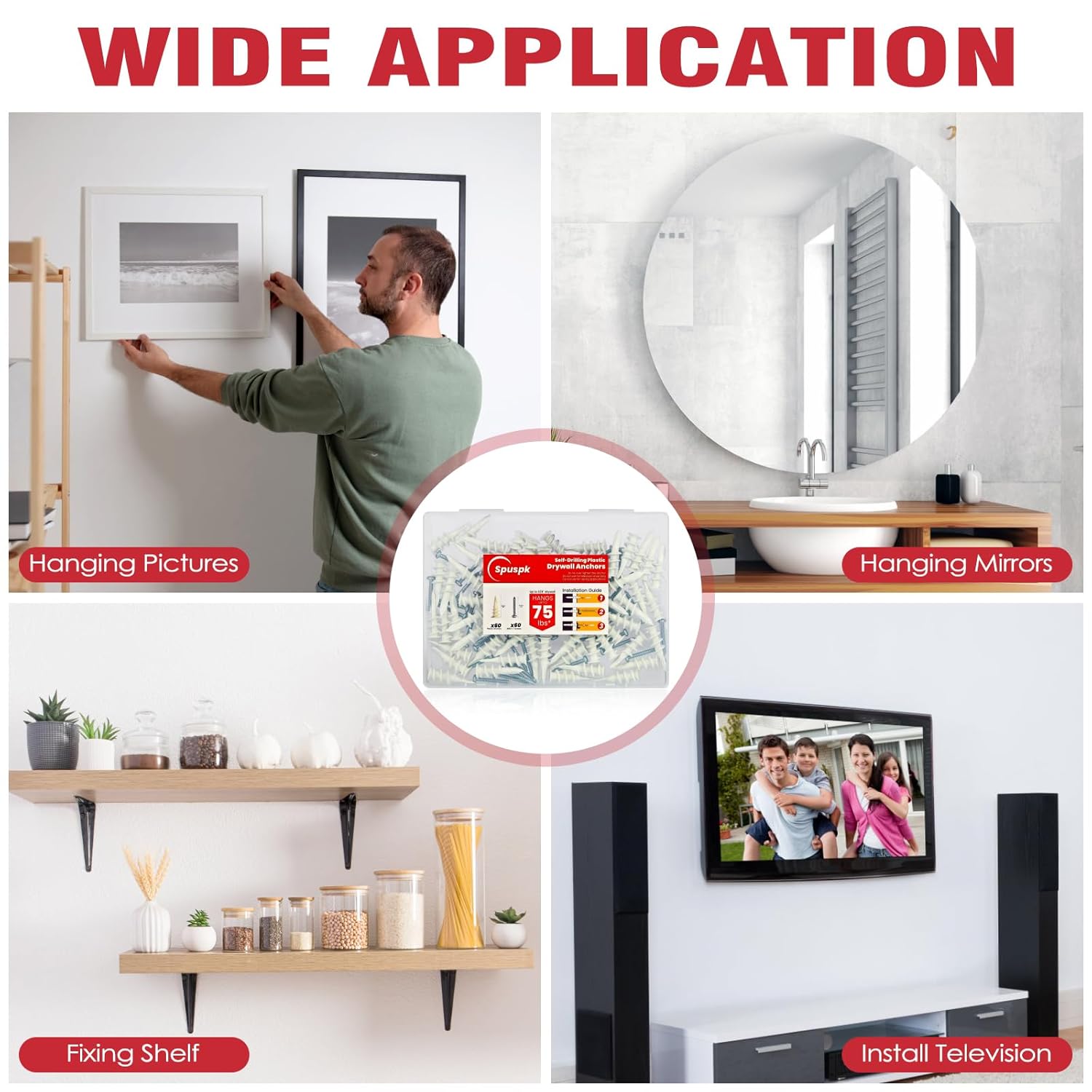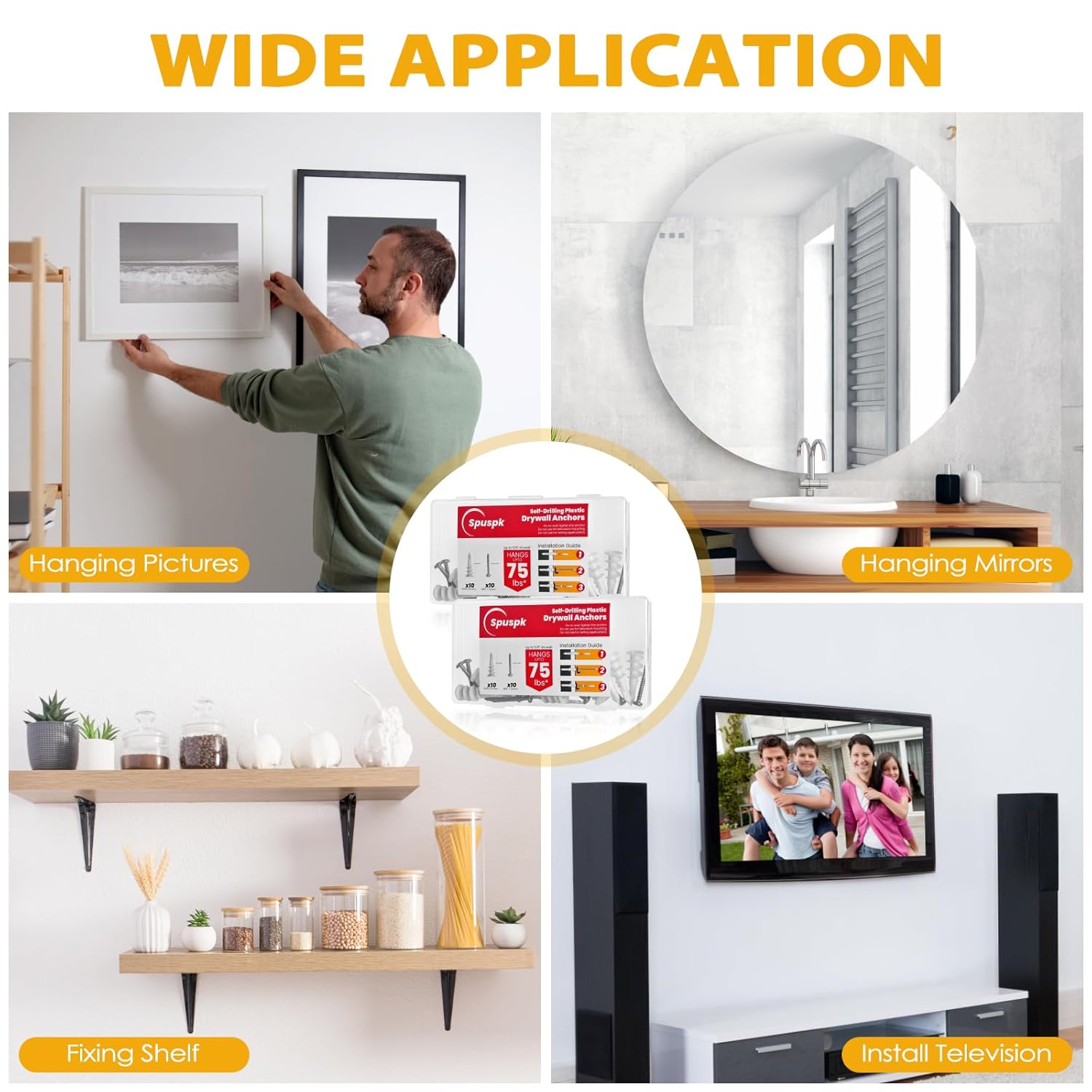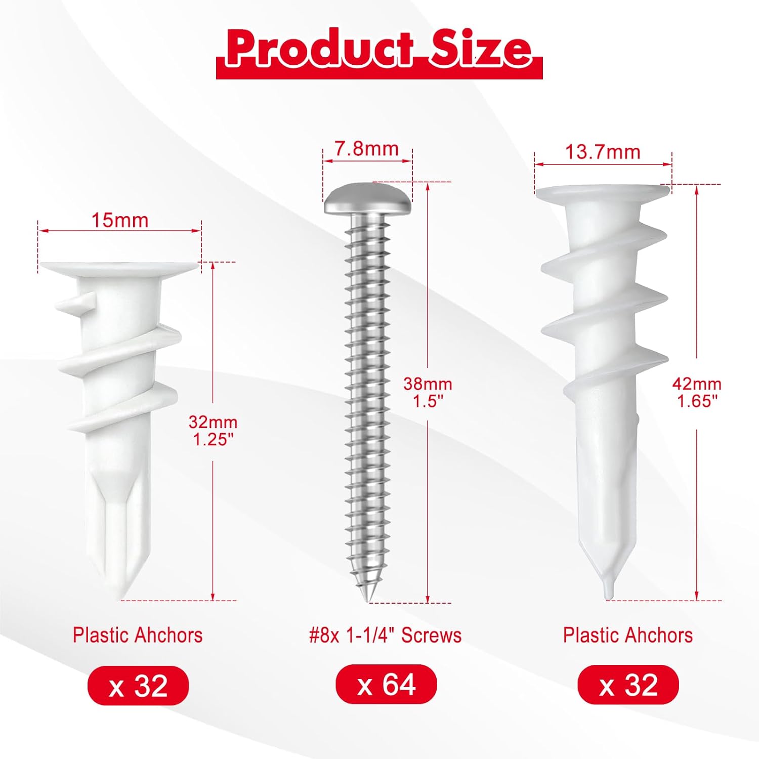【Premium Material】These slef-drilling Drywall anchors are made of high-quality hard nylon plastic mixed with highly robust glass fibers.Compared with ordinary nylon,it has better strength,anti-aging and wear resistant.60Pcs premium galvanized Phillips screws ensures reliable installation and mounting.