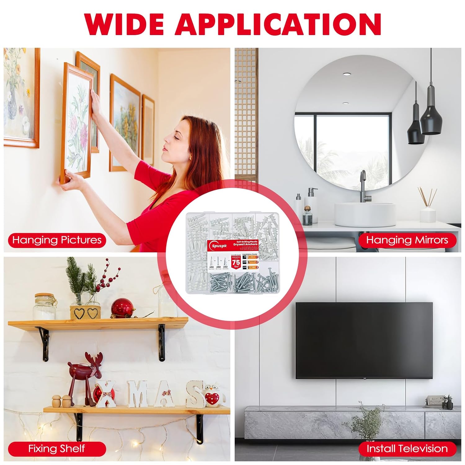 【Widely Application】These self-drilling drywall anchors are very simple to install - No hole preparation required. #8 x 1-1/4'' Anchors and screws kit are suitable for most materials, including masonry, wood, and plaster walls and plasterboard.They are perfect for hanging bathroom and kitchen accessories,l ight fixtures, shelving, mirrors, picture frames,and small decorative shelves, and more.