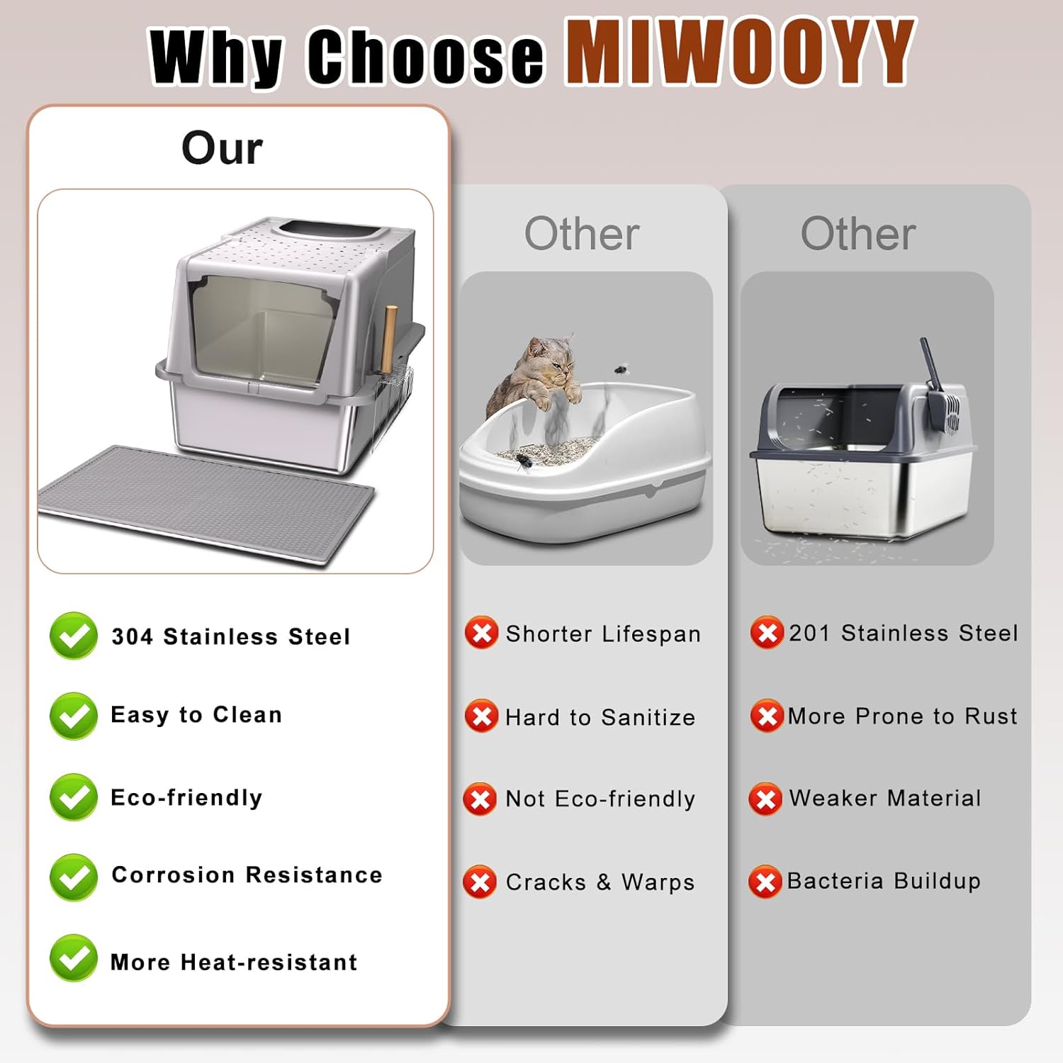 - 【 Heavy Duty 304 Stainless Steel 】: Made from premium 304 stainless steel, this litter box resists odors, stains, and rust—designed to last up to 10 years. The sleek plastic outer shell adds a modern touch and reinforces structural durability.