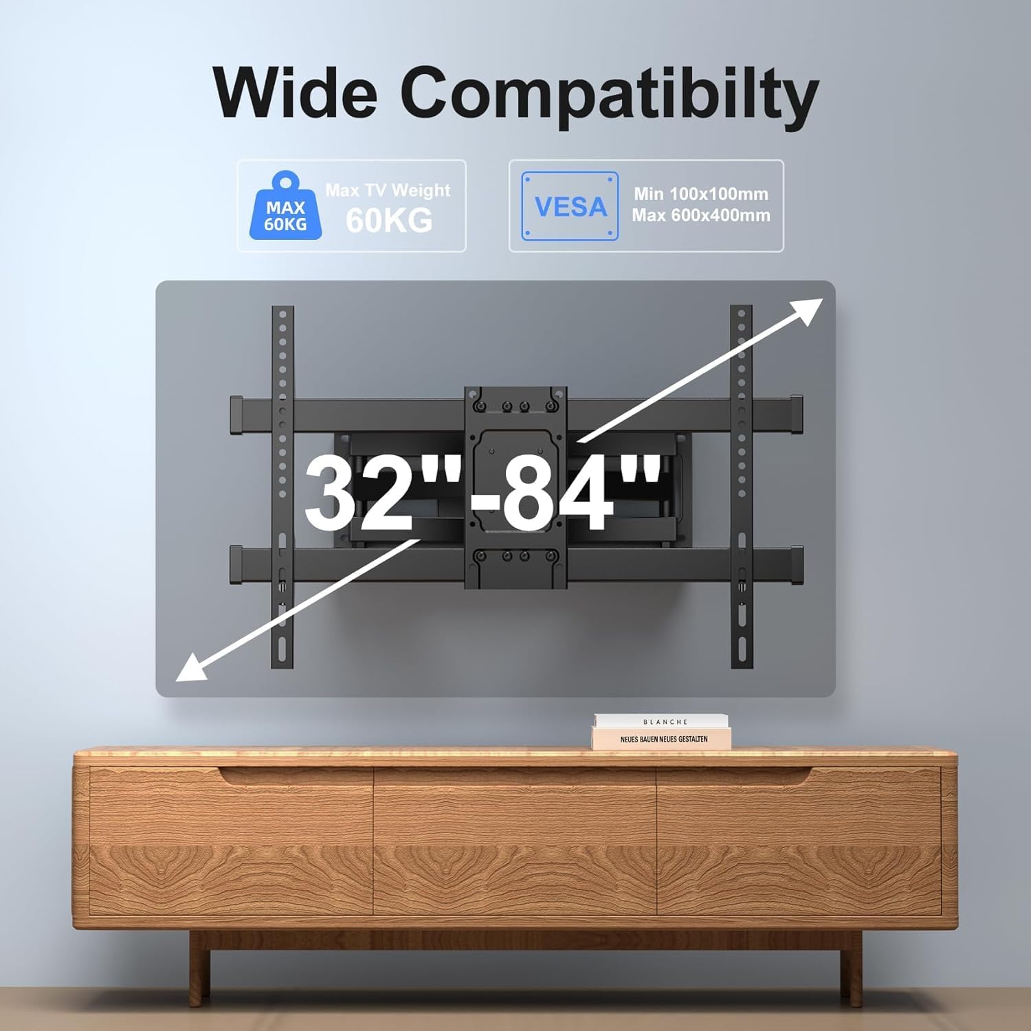 - 【Universal design】- The Full Motion TV Wall Mount is compatible with most 32-84 inch flat screen/LED/4K TVs weighing up to 132lbs. It supports VESA sizes ranging from 100*100mm to 600*400mm and can be mounted on wood studs with a maximum spacing of 16 inches.