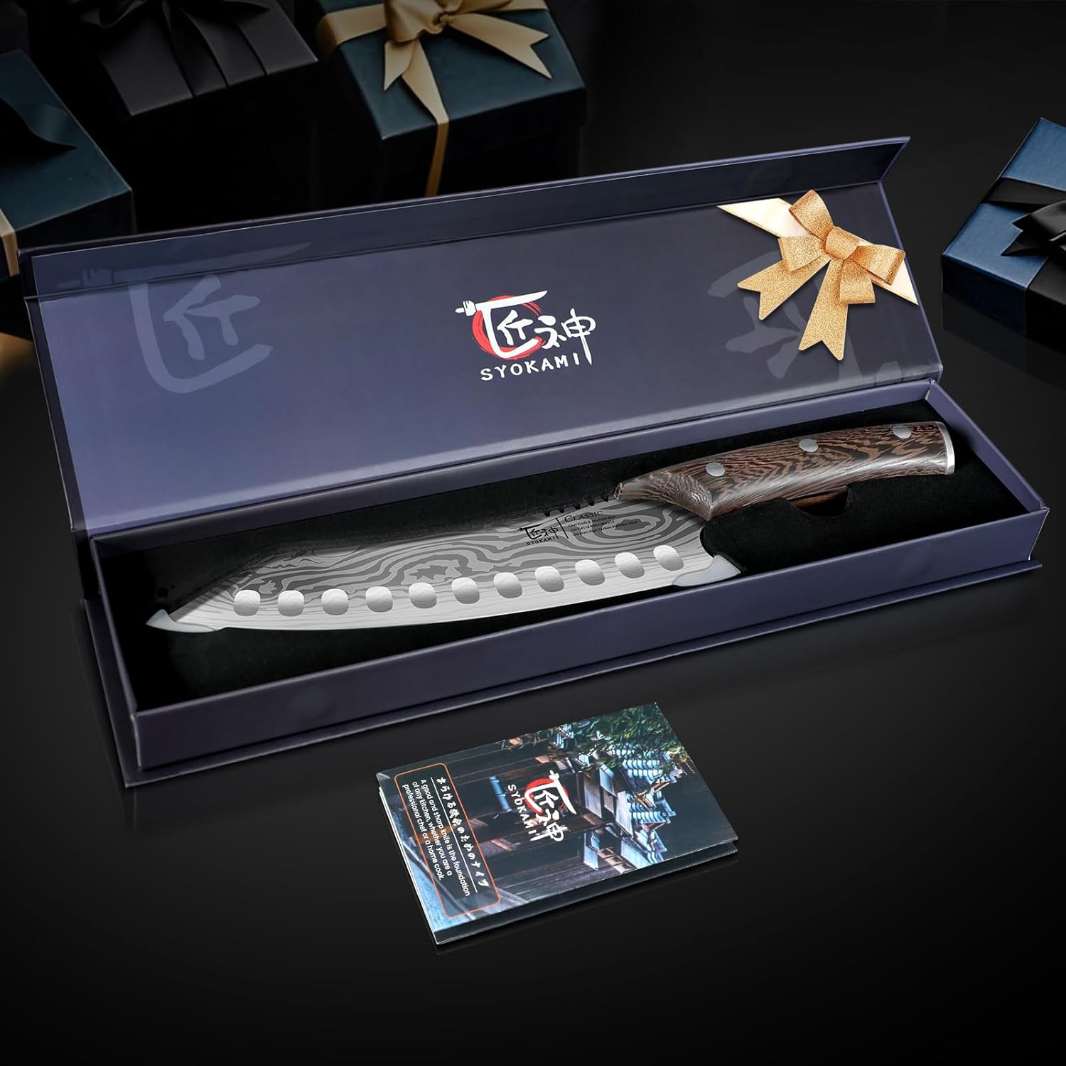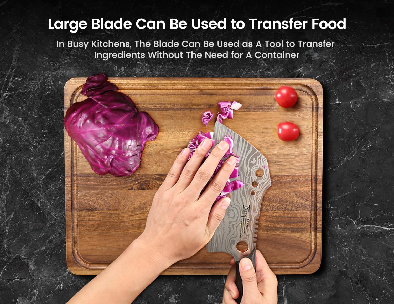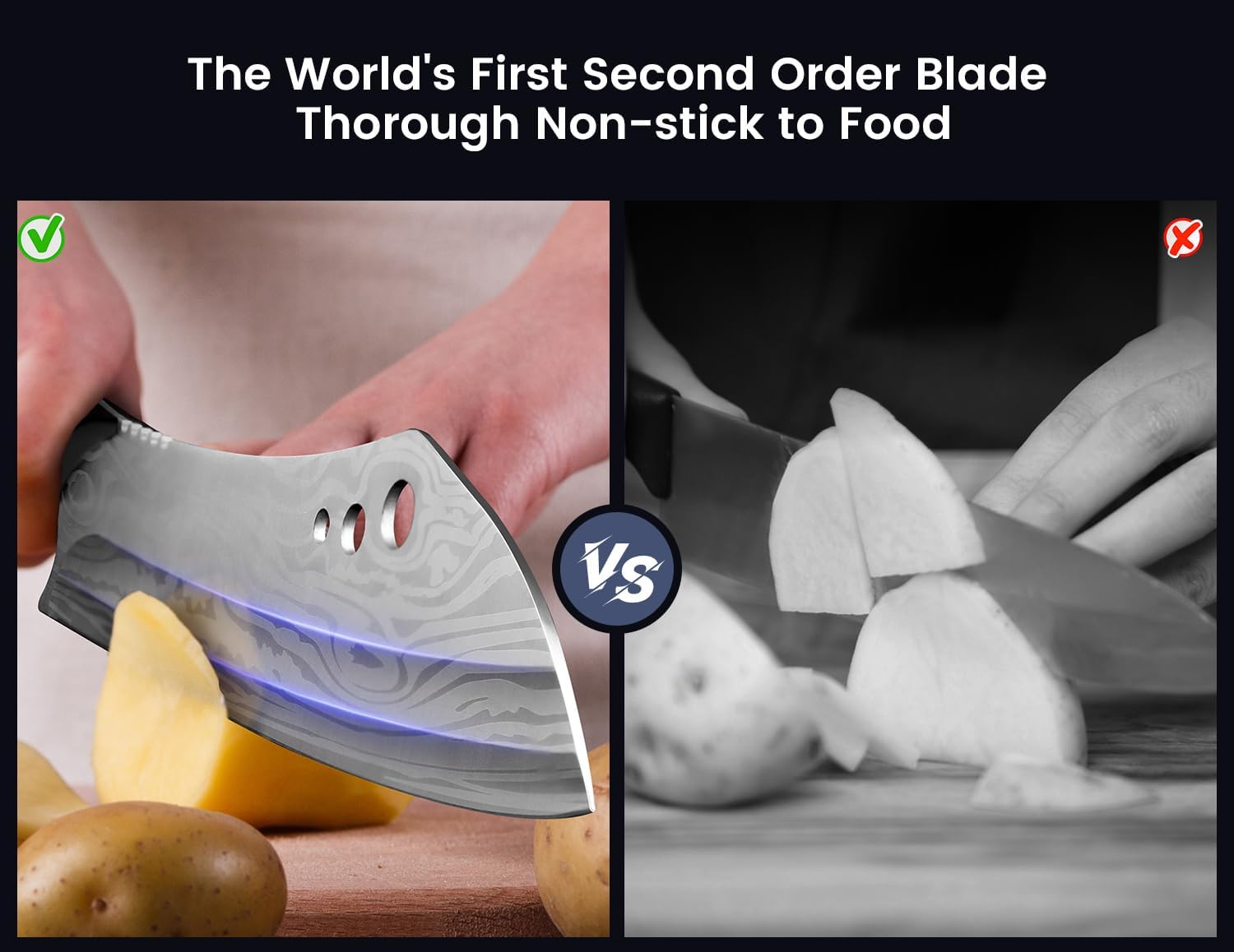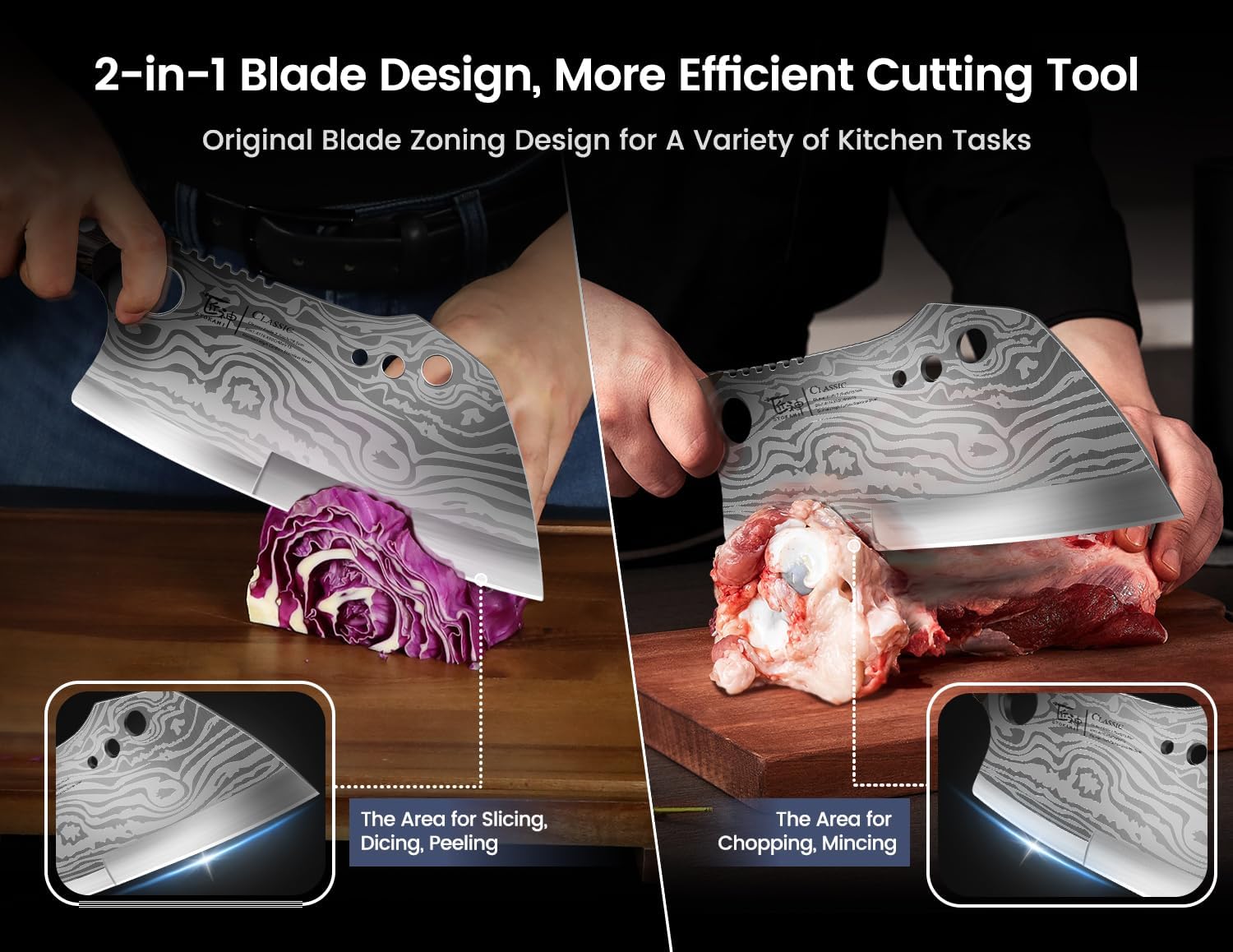 2-in-1 Blade Design: SYOKAMI pioneered the combination of a vegetable knife and a meat cleaver. The front half of the blade is hand-sharpened to 15° per side, which can handle various vegetables and meats; the back half of the edge is 30° per side and can easily chop bones. You only need to buy this one knife, and you can have the functions of two knives