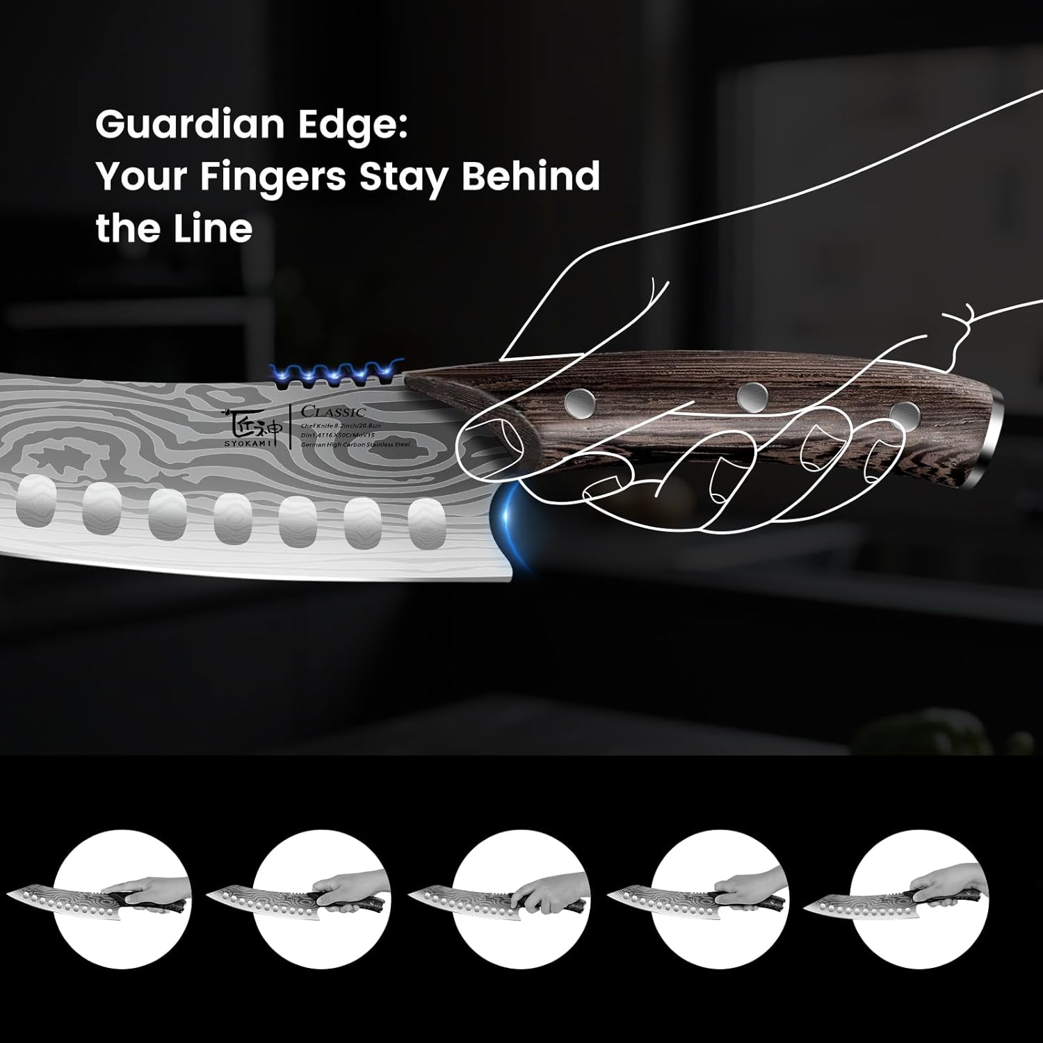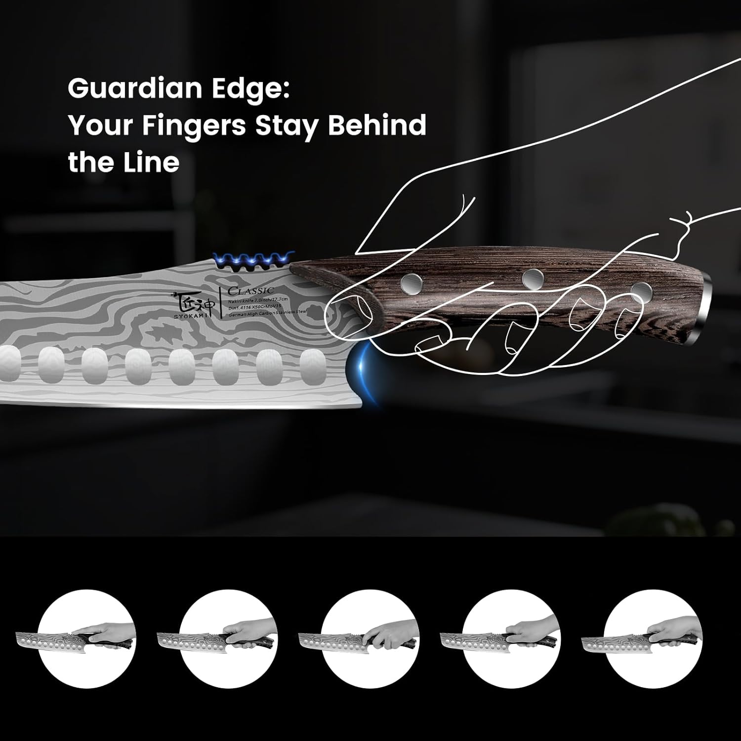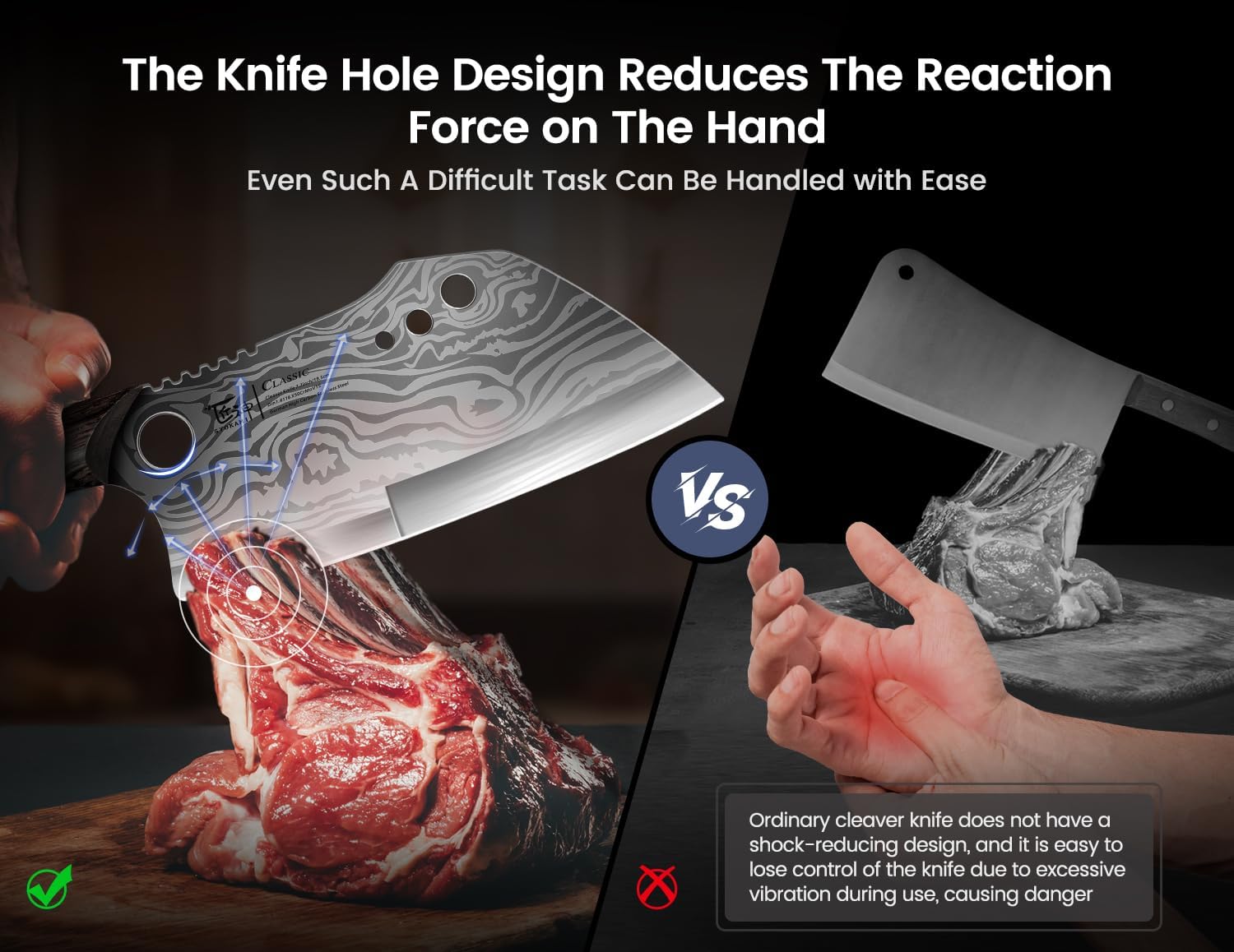For non-slip consideration, we have added a contemporary gear teeth element to this cleaver chef knife. Combined with the overall classic shape, it is both beautiful and practical - ensuring a stable grip even when wet and ensuring your safety while handling your food
