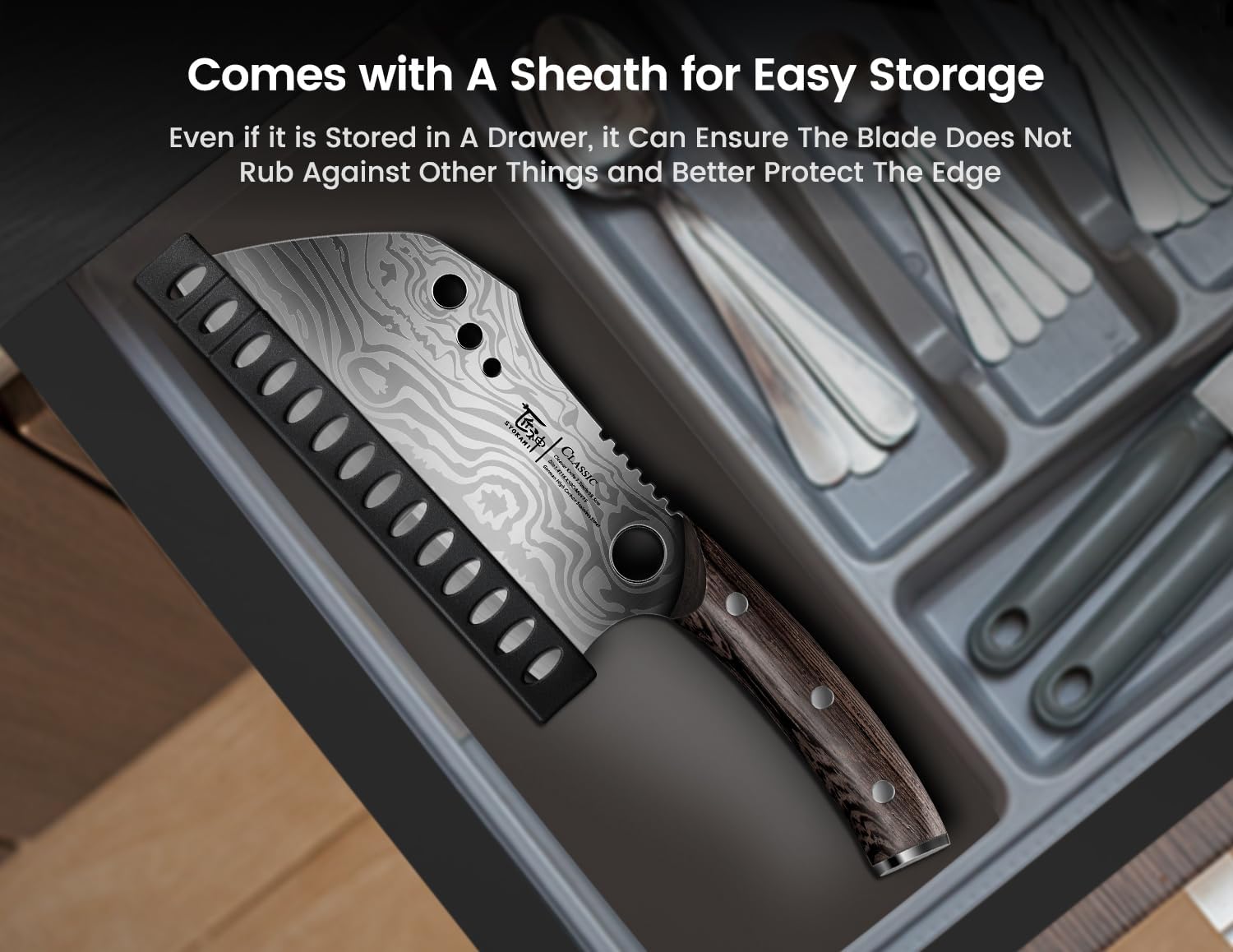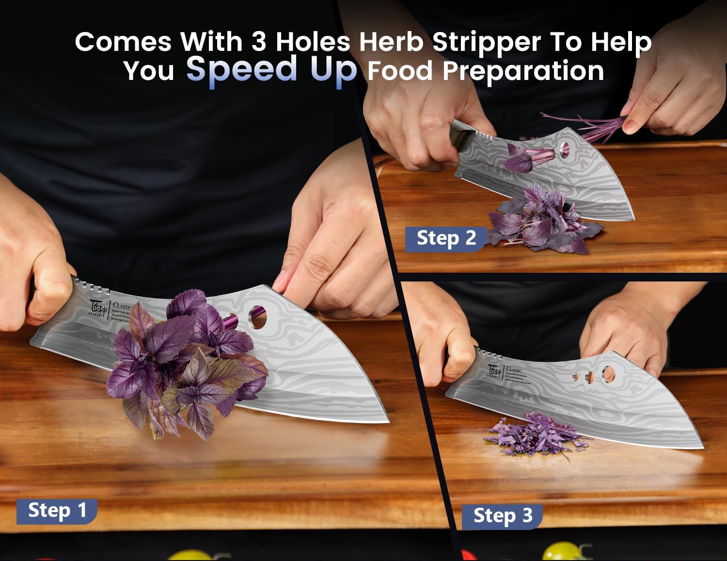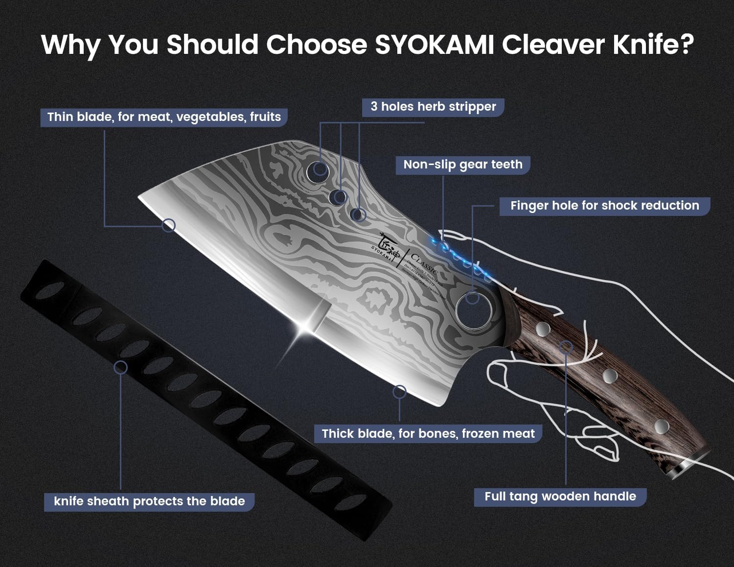SYOKAMI Meat Cleaver Chef Knife, 7.7 Inch Multifunction Butcher Knife with Herb Stripper and Sheath, Chinese Cleaver Heavy Duty Bone Chopper, Meat Cutting, Damascus Pattern Full Tang Wood Handle
