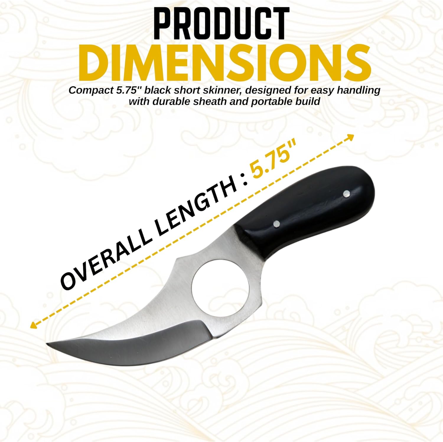 Classic Outdoor Style: Traditional short skinner knife with a dramatic clip-point blade, sleek black handle, and a hand-stitched black leather sheath for a clean, polished look.
