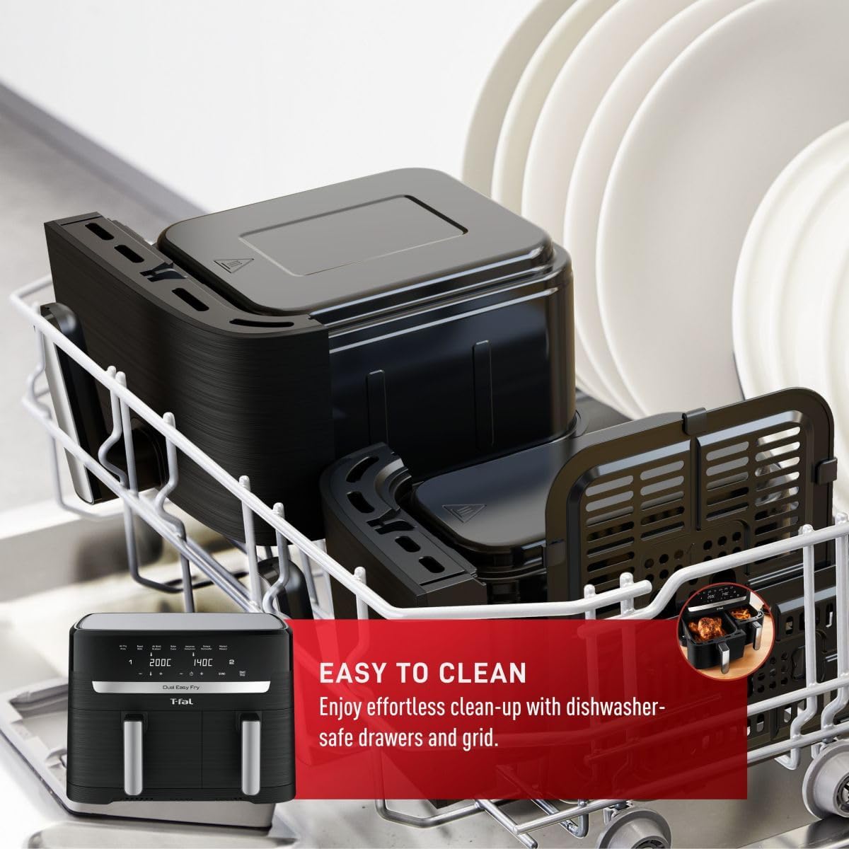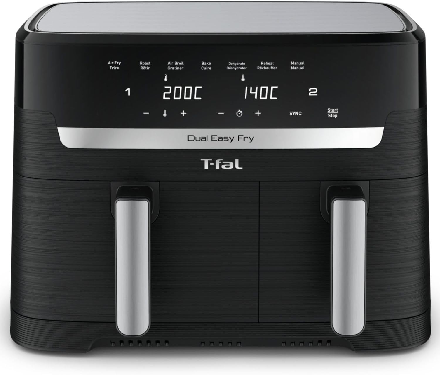 T-fal Easy Fry 7-in-1, with 2 Baskets, 8.3-qt (7.8L), 2-different sized drawers Dual Air fryer, Air Fry, Extra Crisp, Roast, Bake, Reheat, Dehydrate, Sync Mode, Dishwasher Safe Baskets, Black & Metal