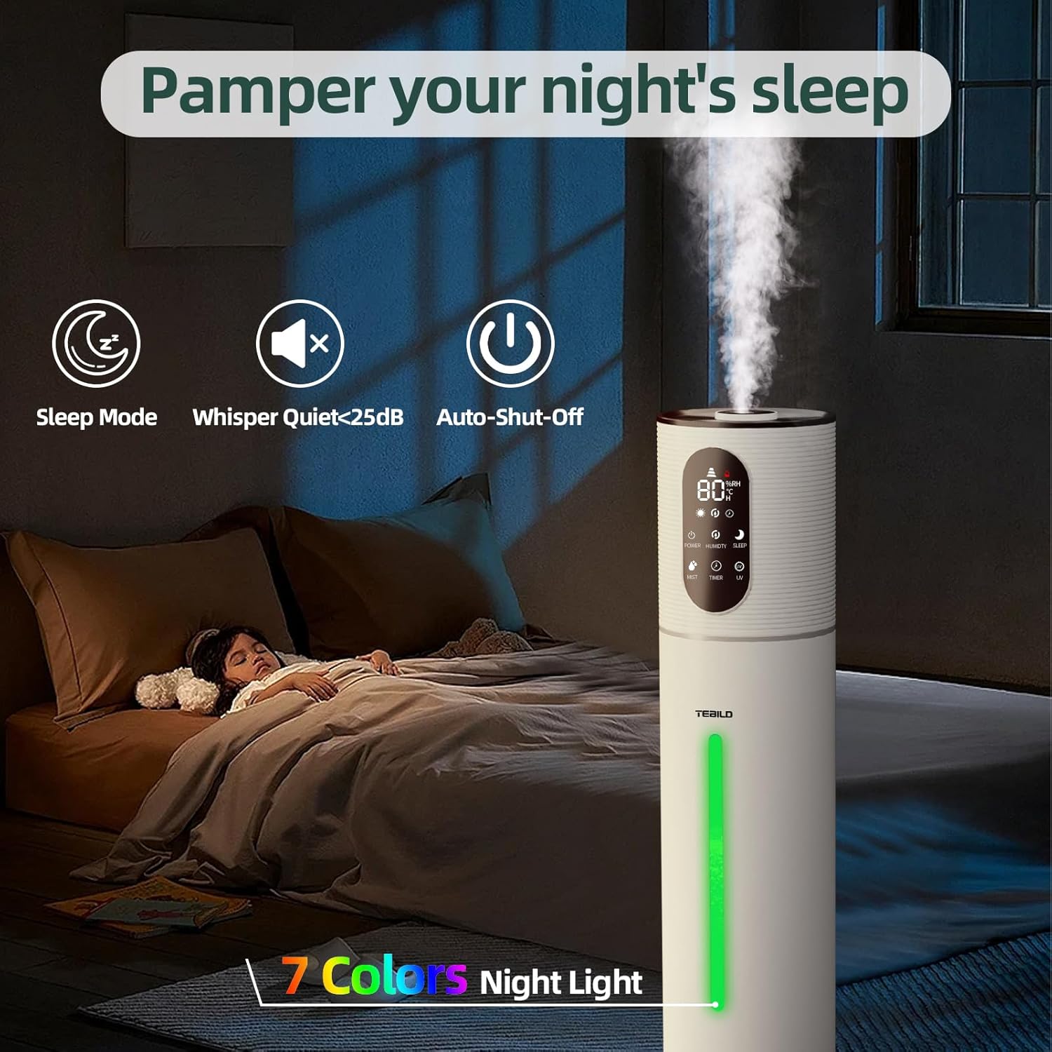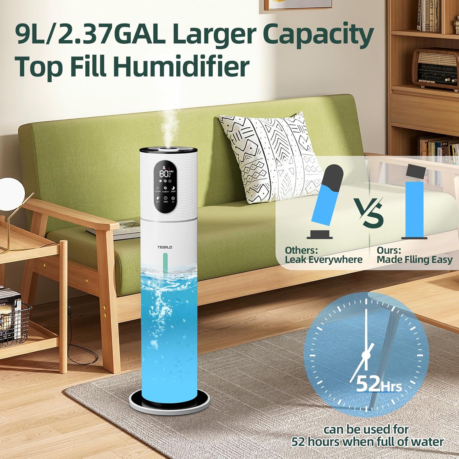 TEBILD Humidifiers for Bedroom Large Room, 9L/2.37Gal Ultrasonic Cool Mist Humidifier Top Fill Last Up to 52H with 360°Nozzle,Sleep Mode,Night Light,Quiet Large Humidifier for Baby,Home,Office
