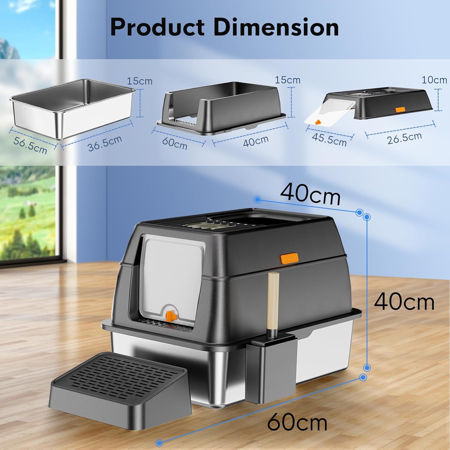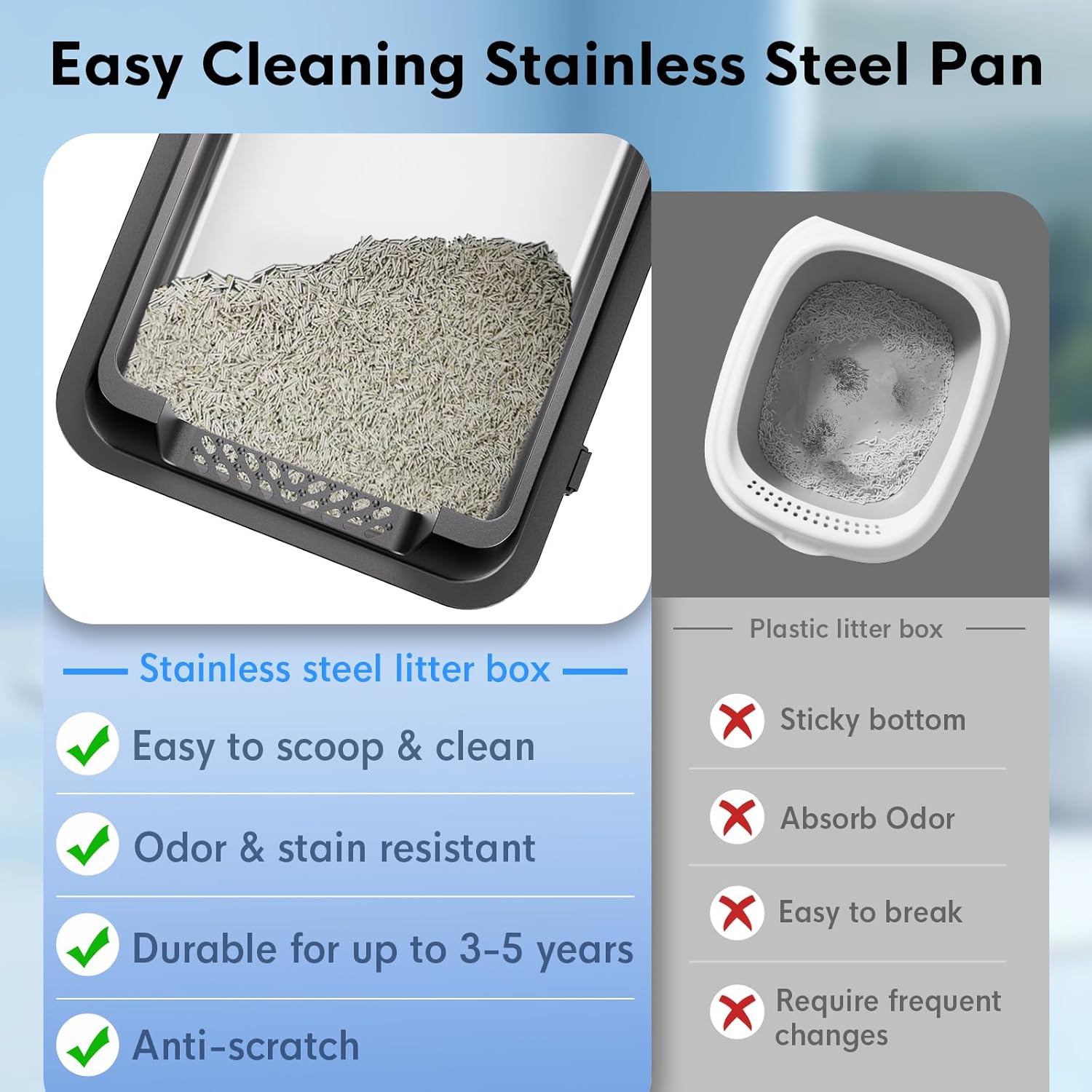 【Durable & Easy Clean】Constructed with solid stainless steel and heavy-duty plastic, our cat litter box is built to last up to 5 years. Unlike plastic options, metal litter box resists stains and odor, wipes down easy, helping provide a clean, hygienic space for your cats.