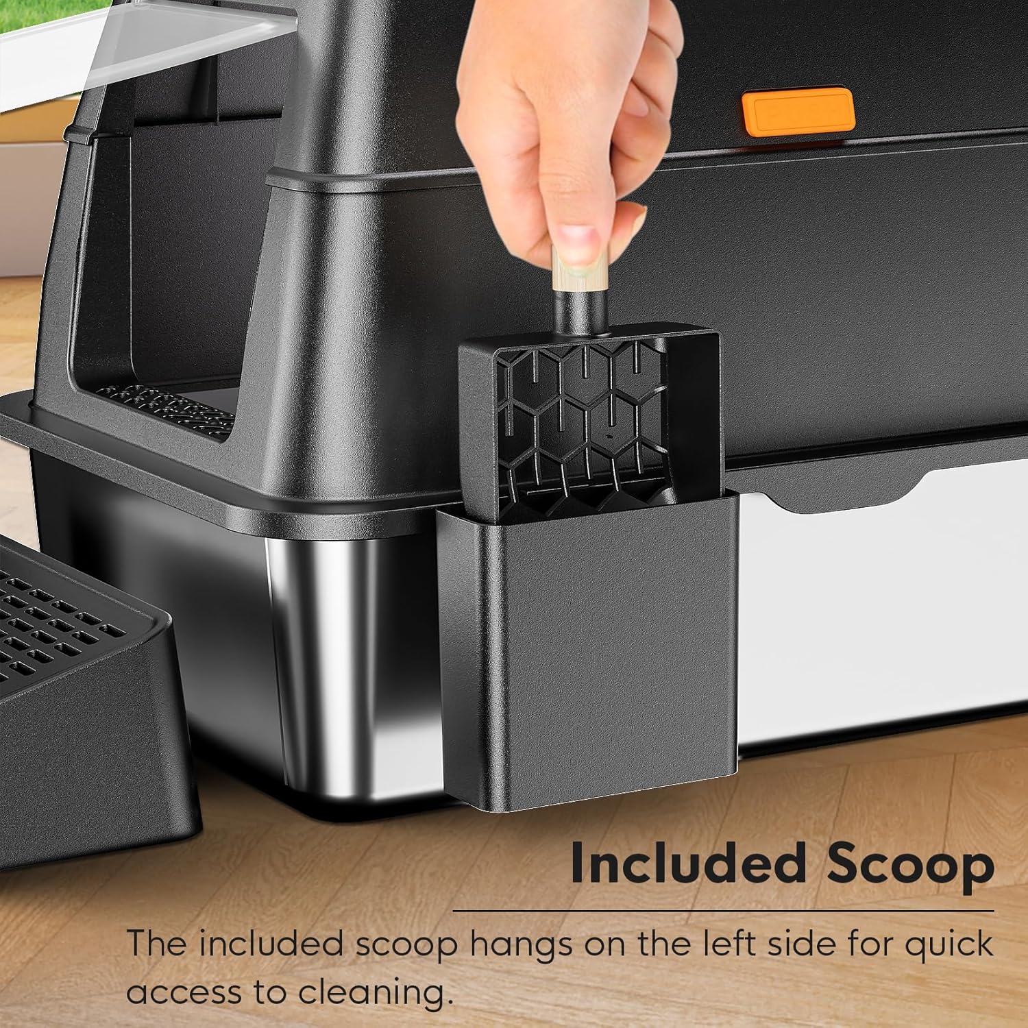 【Included Scoop & Pedal】our enclosed cat litter box comes with everything you need. The inclued scoop can be stored on the side of litter box so you always have it handy for quick and easy cleaning. The filter pedal helps catch the litter pieces of your cats paws.