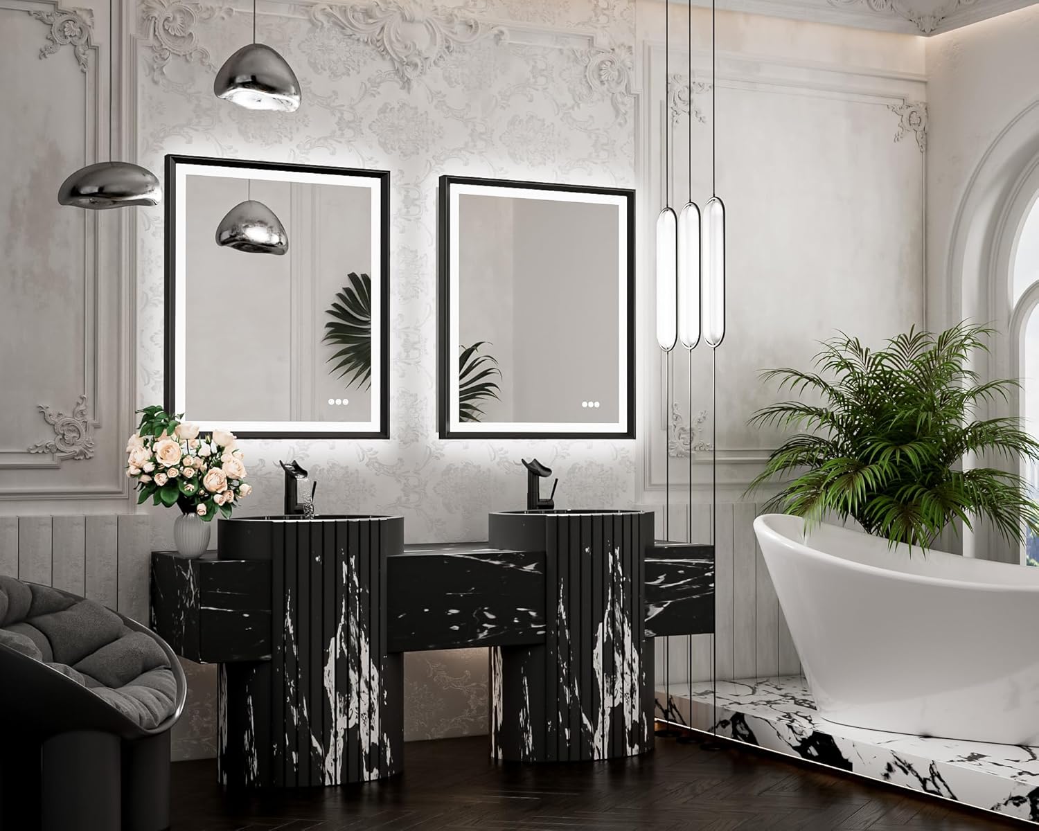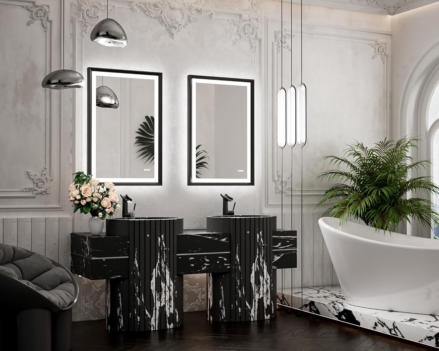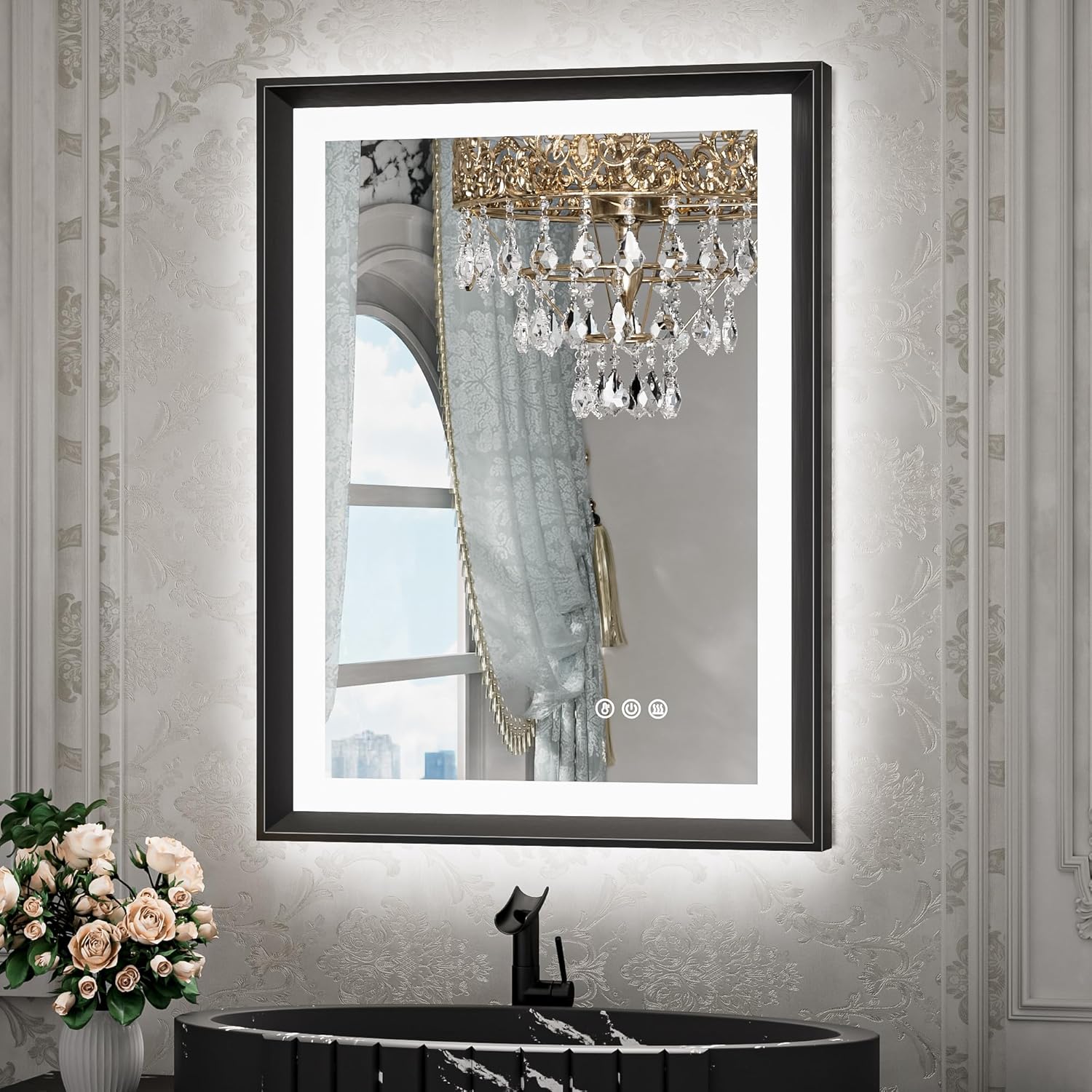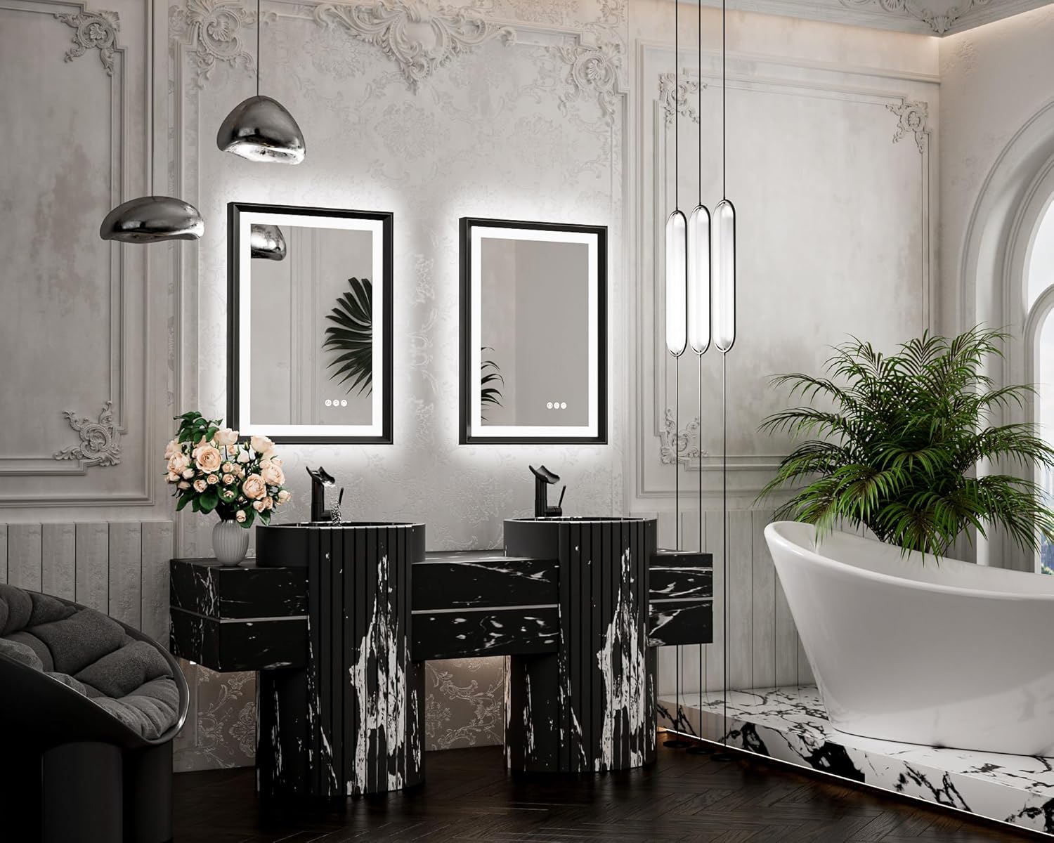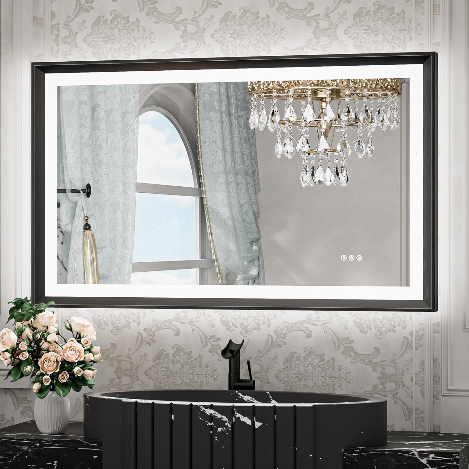 - ✨【Modern Black Metal Frame & HD Shatterproof Glass】Black aluminium brushed Framed design makes your bathroom more noble.3.0 ECO mirror using 5mm HD shatterproof glass with waterproof LED light ensures 100% safety in wet bathroom.