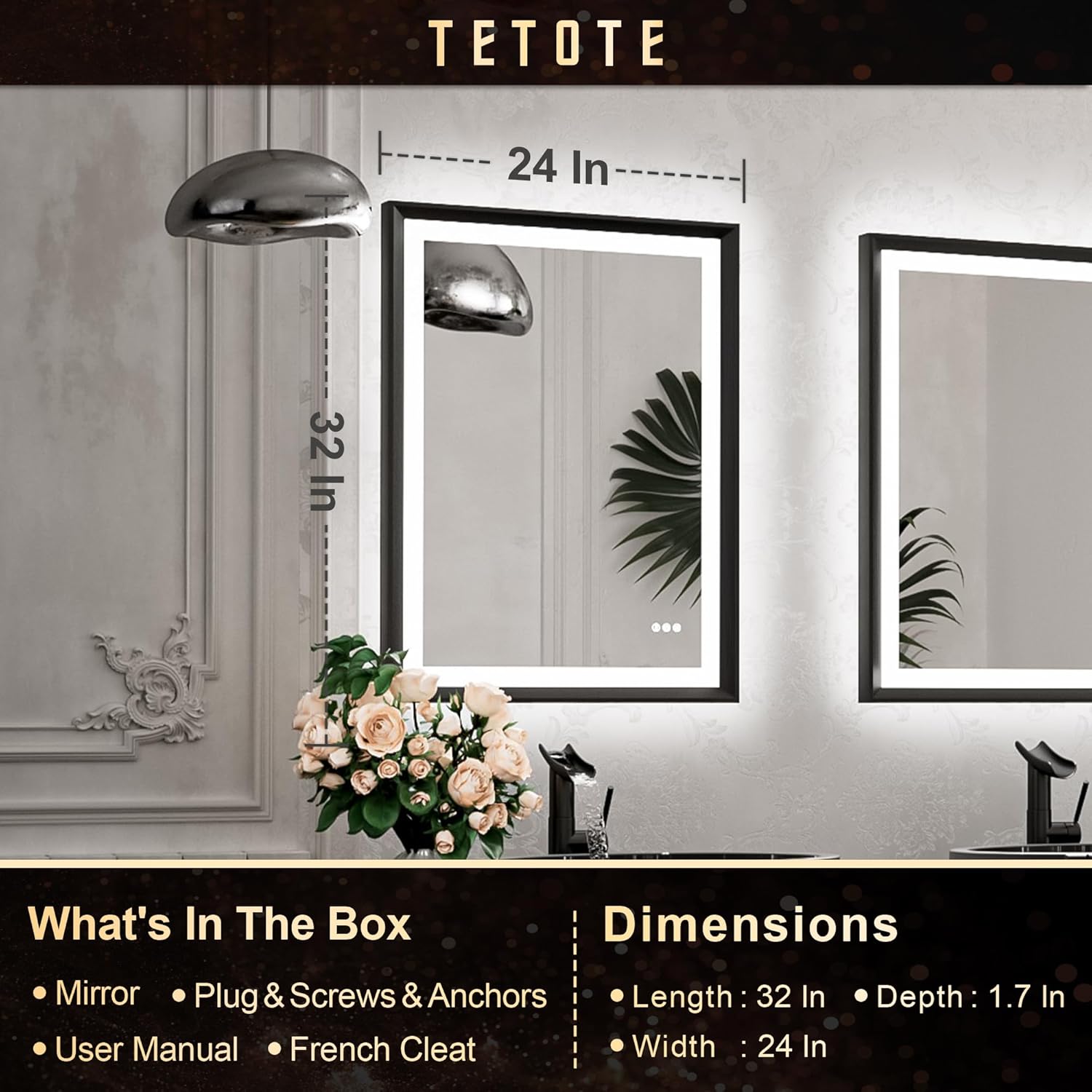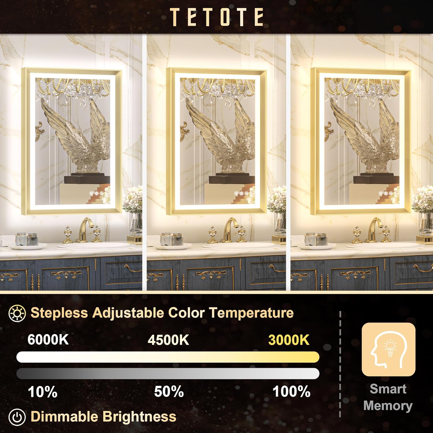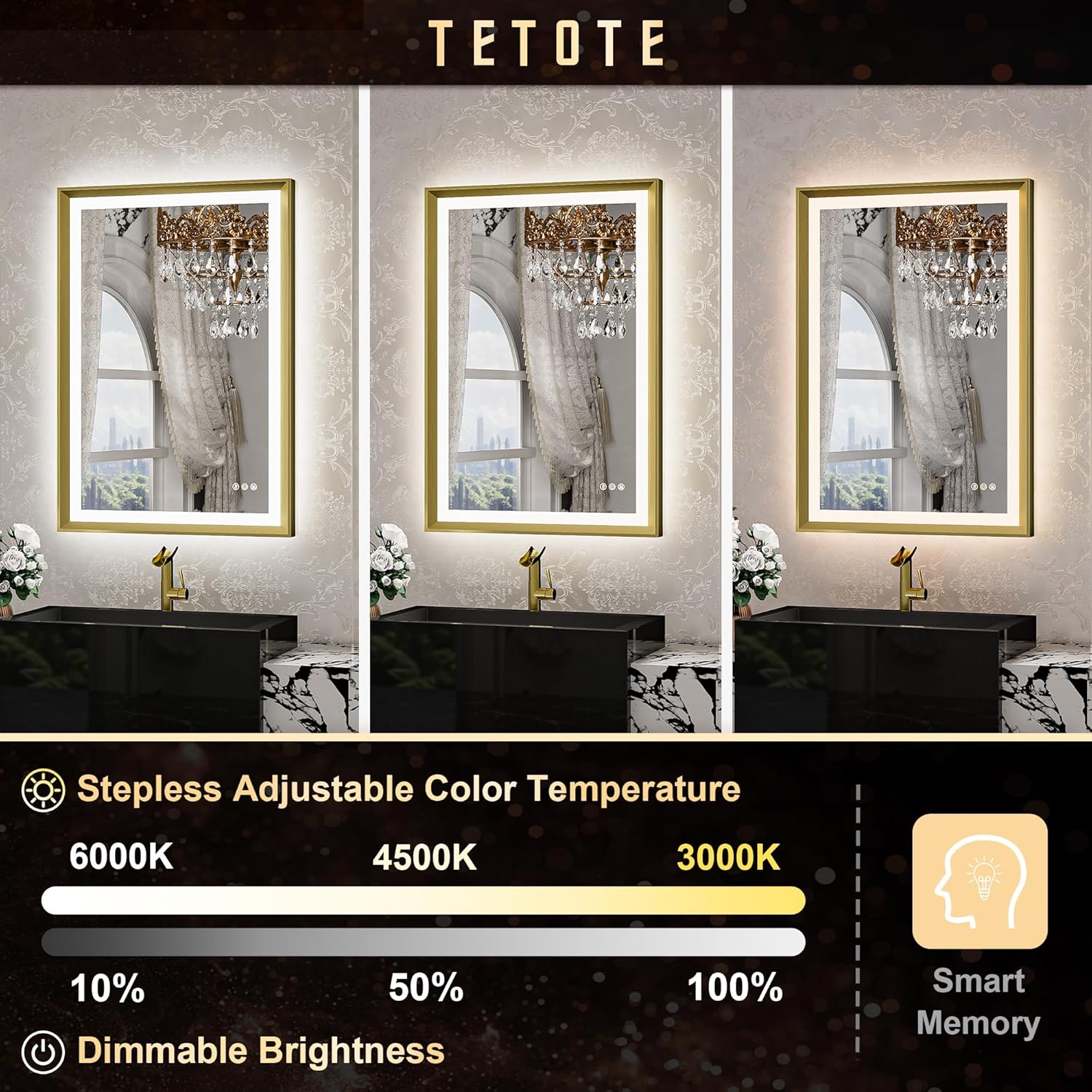 - ✨【3 Color Frontlit & Backlit】TETOTE LED Bathroom Mirror with double high density LEDs light strips shows brighter and softer backlit & frontlit lighting.Brightness and color temperature can be stepless adjusted,3000K-6000K Warm/Natural/White Lighted CRI 90+ rendering perfectly for makeup or selfie.The SMART MEMORY always kept the best setting.