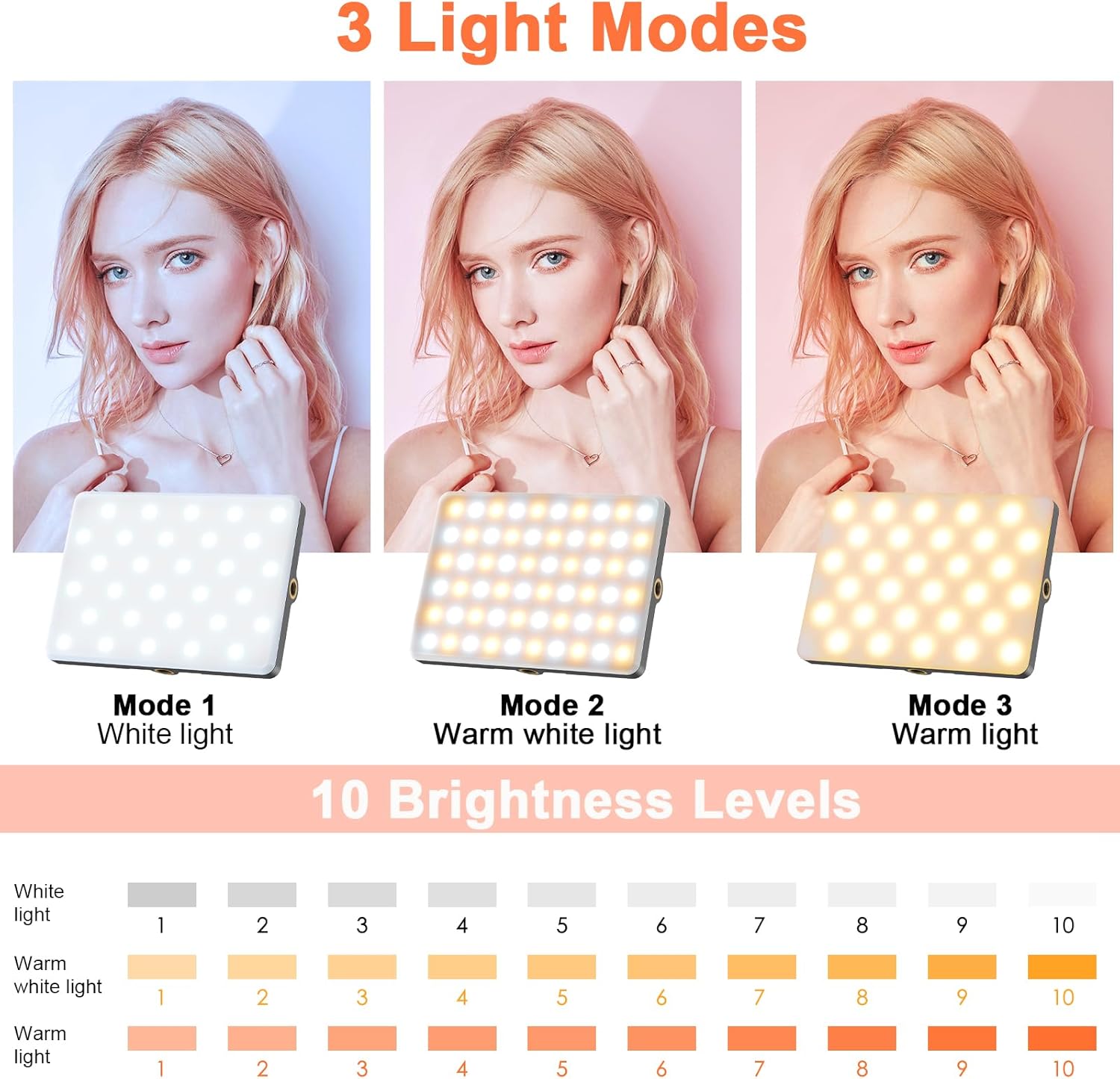 【3 Colors & 10 Brightness Levels】Equipped with 60 LED beads, the portable led light offers adjustable illumination ranging from 2500K to 9000K, providing 10 different brightness levels. Compared to regular selfie lights, it produces brighter and softer lighting. Additionally, the lighting for video recording offers three adjustable color temperatures, ensuring that you have the best lighting regardless of the ambient environment.