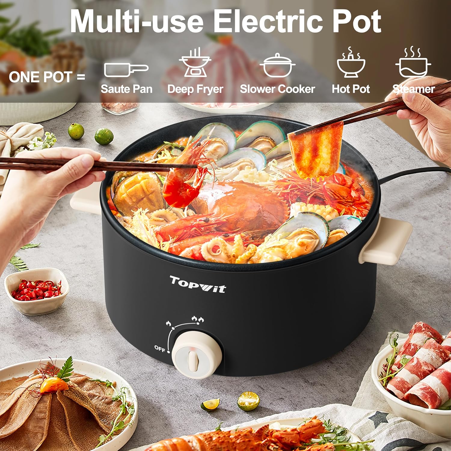 TOPWIT - 4.2 Quart Electric Pot with Non-Stick Coating, Dual Power Frying, Steak, Pasta, Multifunctional Large Capacity Shabu Shabu for Parties