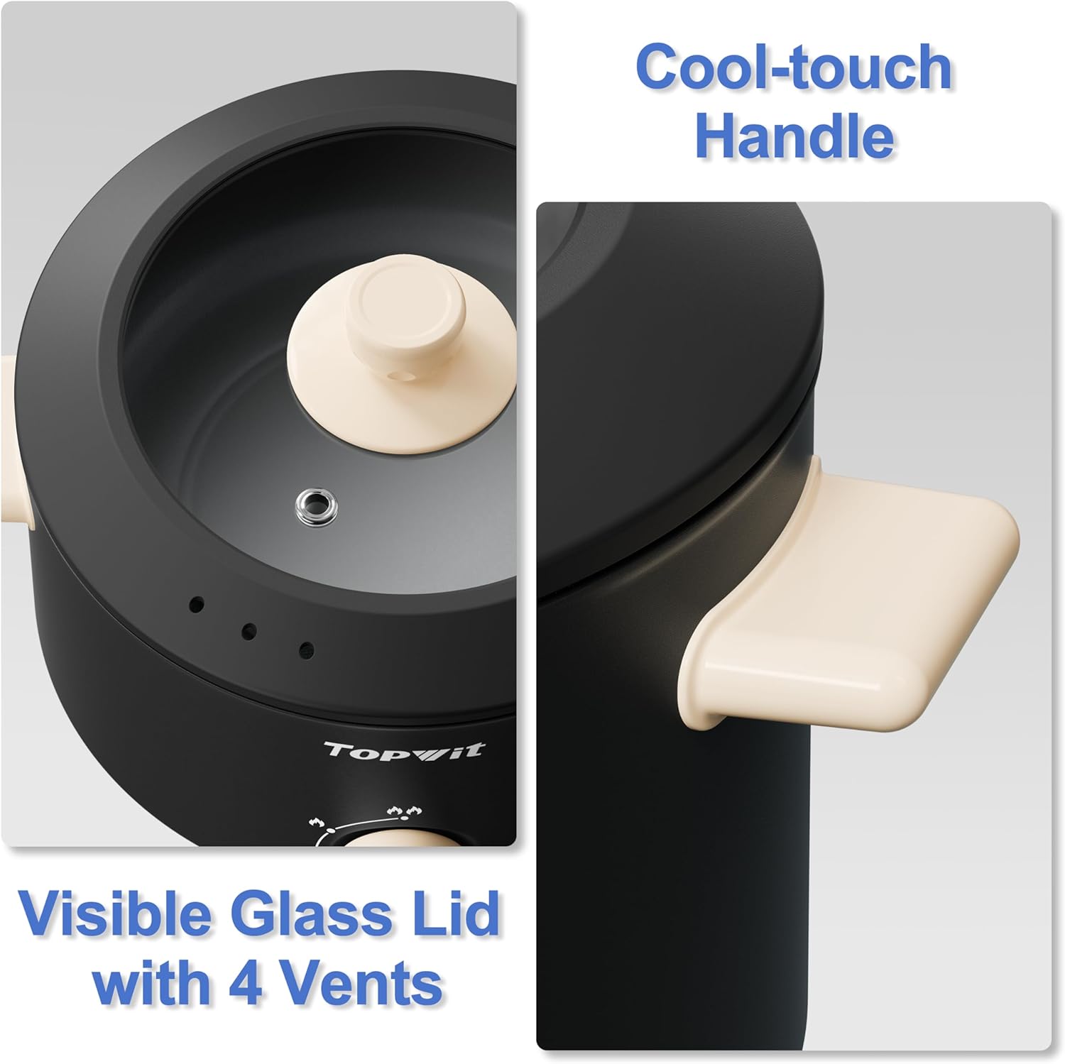 【Dual Power Electric Pot】With 2 adjustable power levels, this TOPWIT dark gray electric pot meets your different cooking needs. It can replace various traditional cookware for stoves, bringing more convenience to your life. The low power setting (400W) can be used to cook eggs, oatmeal, instant noodles or pancakes, while the high power(1000W) is suitable for steak, hot pot or fry chicken and fries.