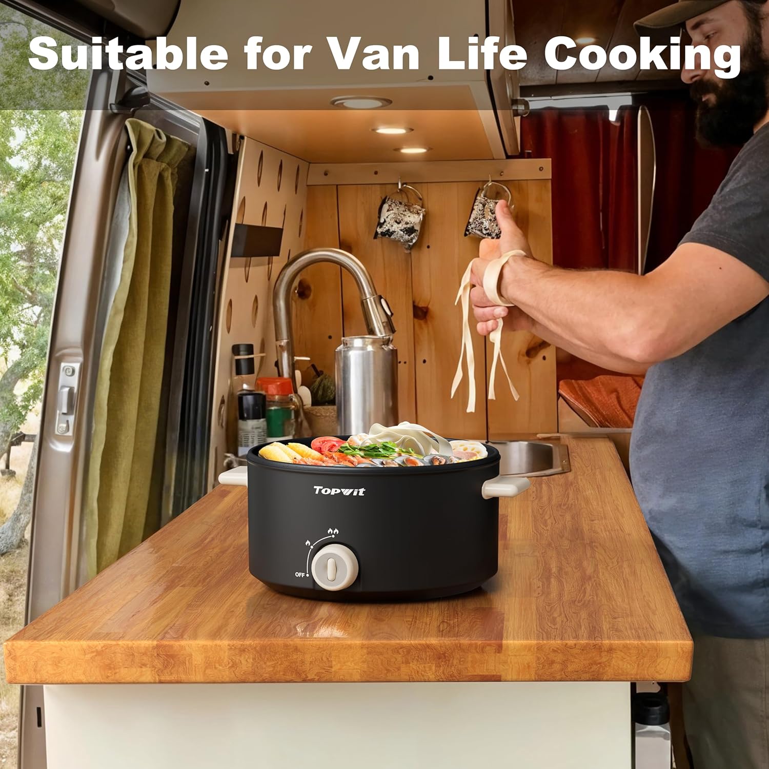 Healthy Material & High Safety The inner pot of this electric fryer is made of food-grade non-stick coating, does not contain BPA and PFAS, allowing you to move food smoothly in the pot to prevent sticking and cook with low fat and oil content for healthier meals. After cooking, the surface can be easily cleaned with water and a sponge. In addition, TOPWIT electric cooker is equipped with overheat protection, automatically turning off the power when the pot is dry or overheated.
