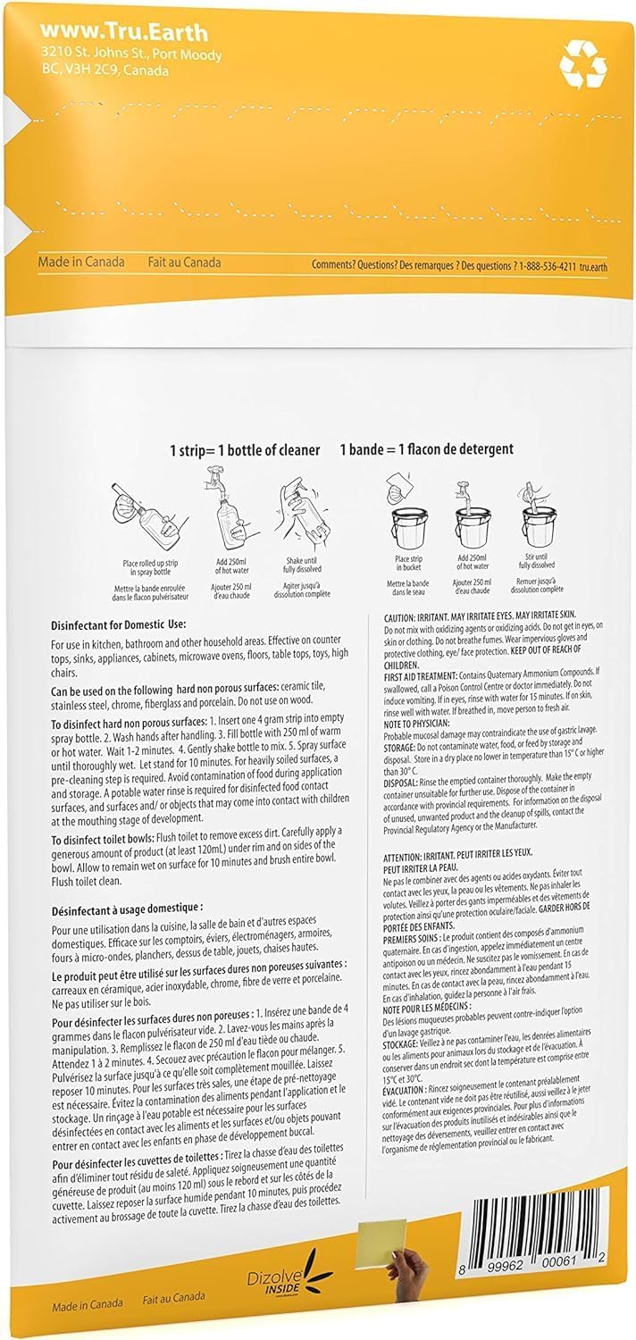 - NO MEASURING, NO MESS: Tru Earth’s Disinfecting Multi-Surface Cleaner strips let you refill the spray bottles you already have. Simply toss a strip in an old spray bottle, add hot water, and shake.