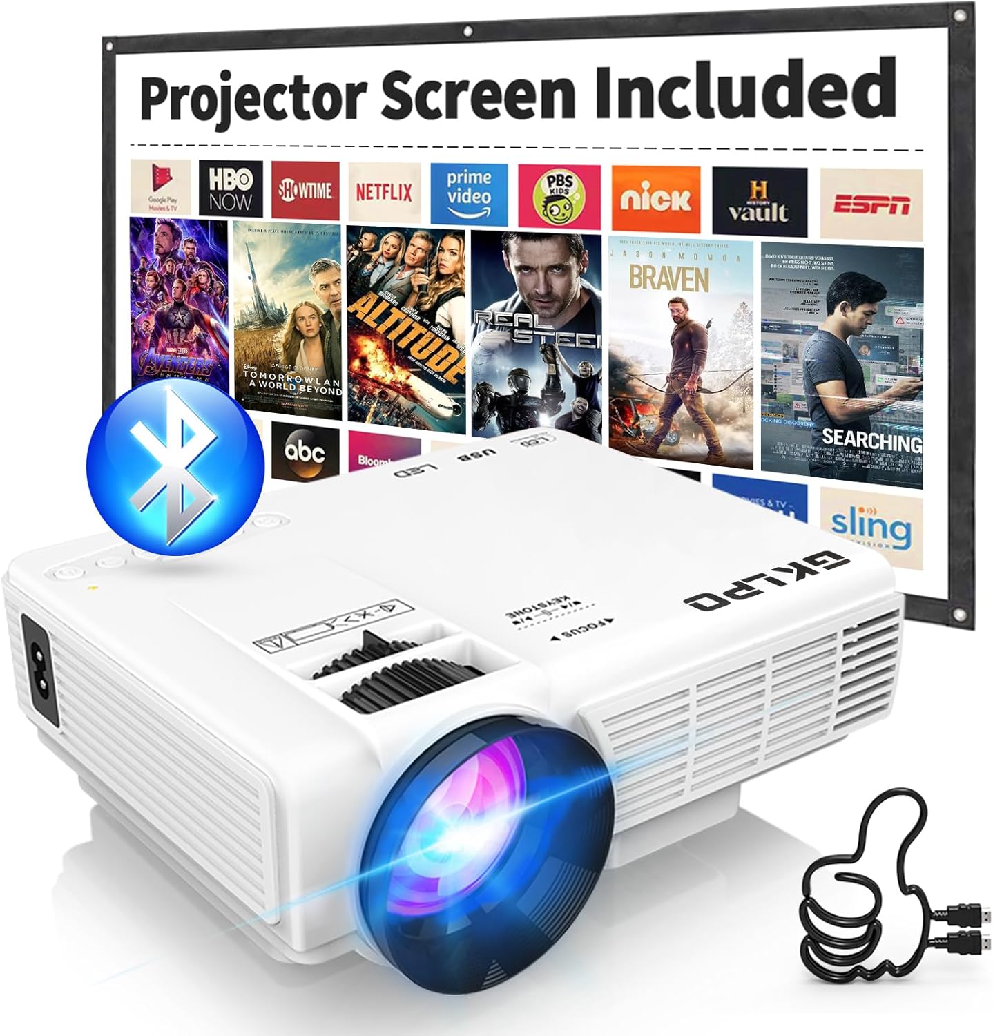 Special features With a 80'' projector screen, Two-way Bluetooth 5.2 & Bulit-in Speaker, 1080P Support, Digital Keystone Correction & 50% Zoom