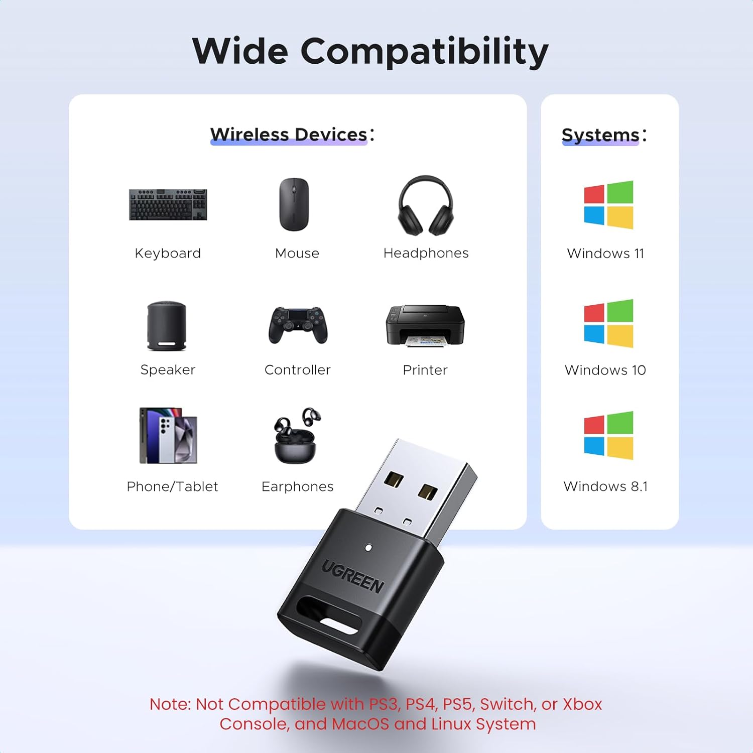UGREEN Bluetooth 5.4 Adapter for PC, USB Bluetooth Dongle for Windows 11 10 8.1, Plug and Play, Mini-Sized, 5-Devices Connect for Wireless Keyboard Mouse Headphone Speaker