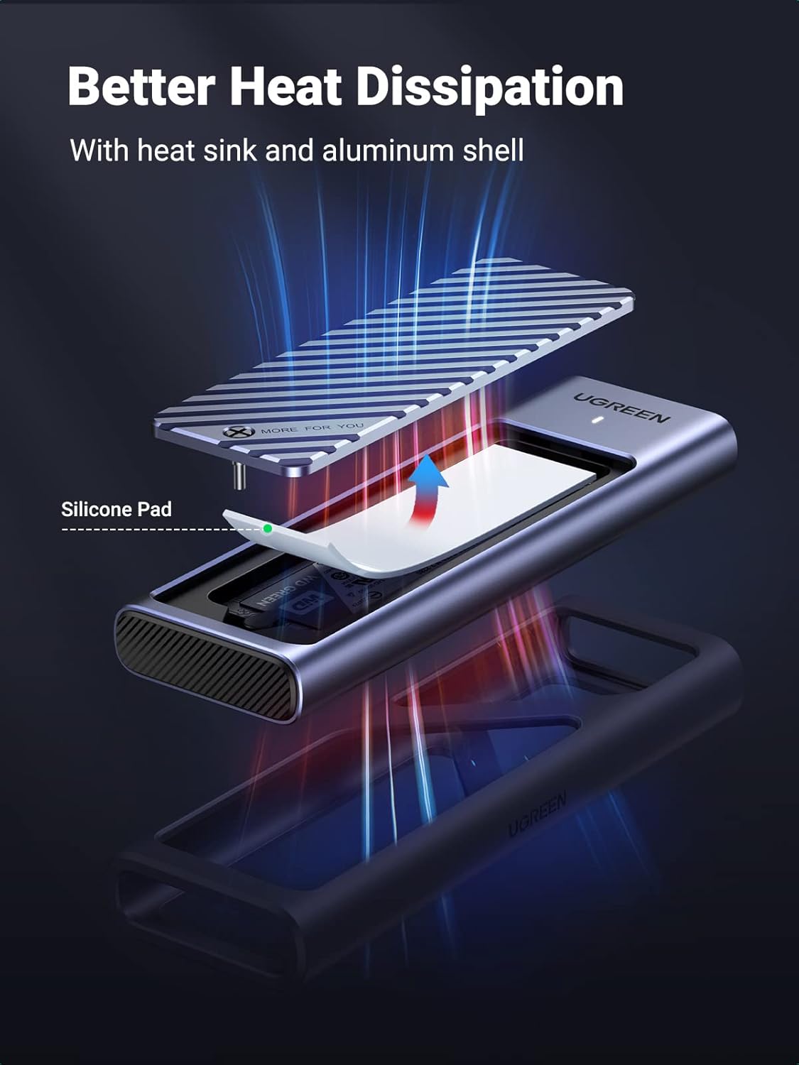 • Efficient Heat Dissipation: This M.2 SATA SSD enclosure USB C features an aluminum case, which can better heat dissipation by direct contact with the aluminum alloy shell, a thermal pad that makes good contact with the grooved case, keeping the M.2 NVMe enclosure cool at high speeds and protecting data from high-temperature damage