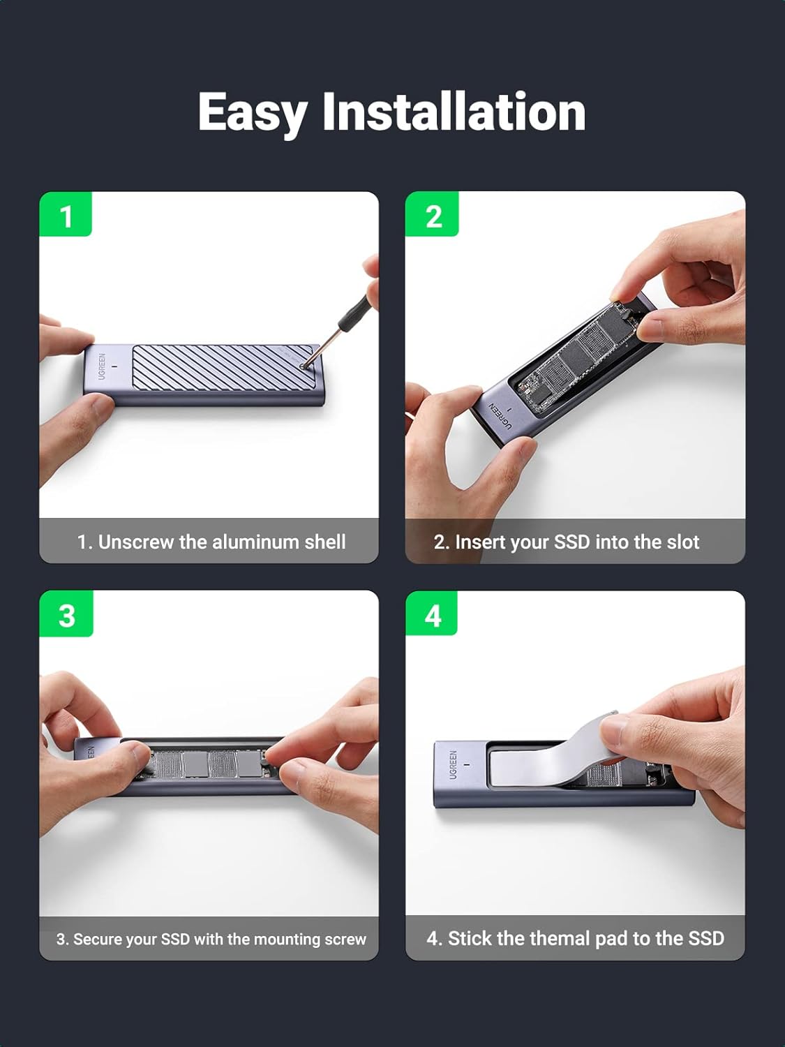 • Both for NVMe SATA SSD: UGREEN NVMe SATA enclosure designed for both M.2 NVME PCIe M-key and (M+B) key SSD and SATA NGFF (M+B) key SSD. Suitable for 2280 2260 2242 2230 size. Kindly Note: Doesn't support SATA B-Key