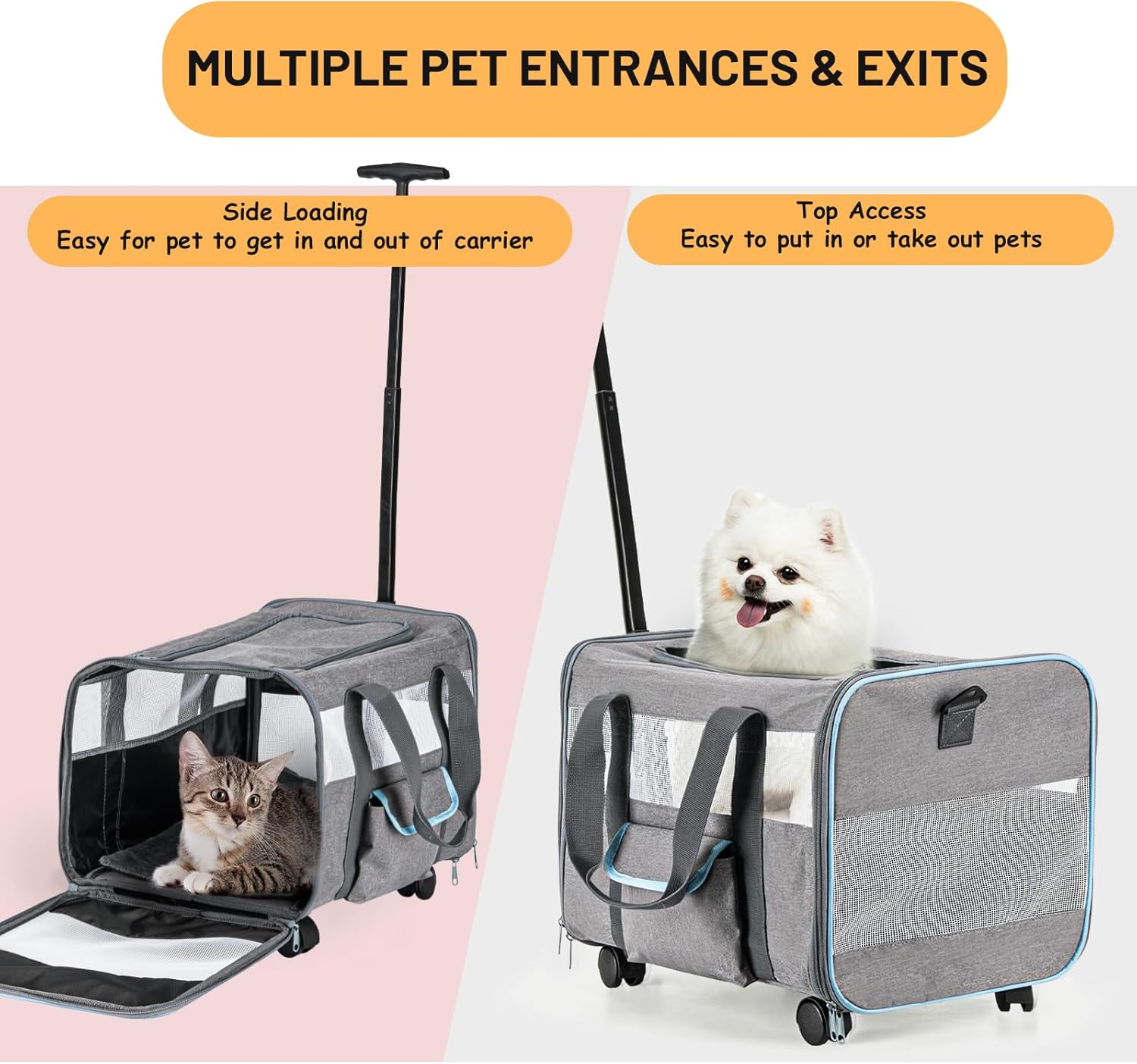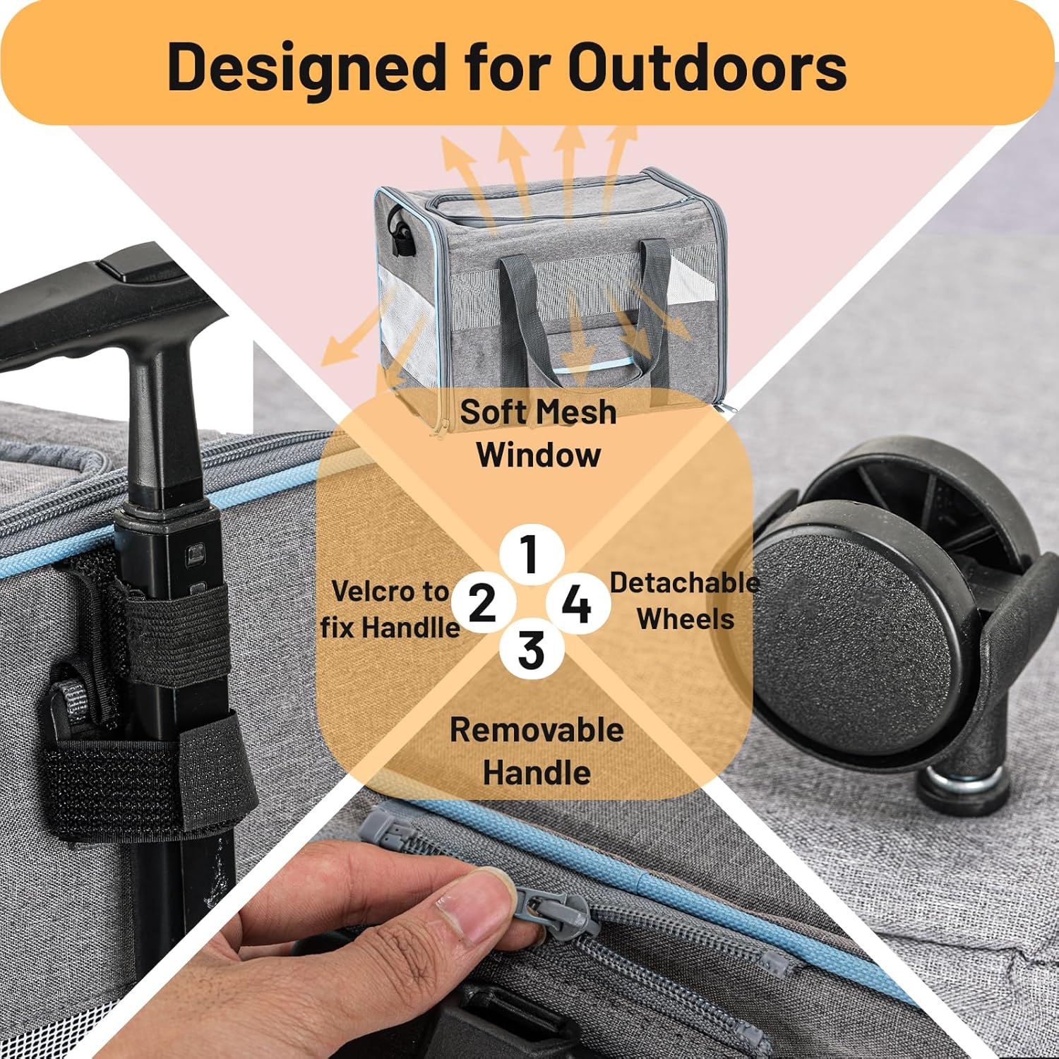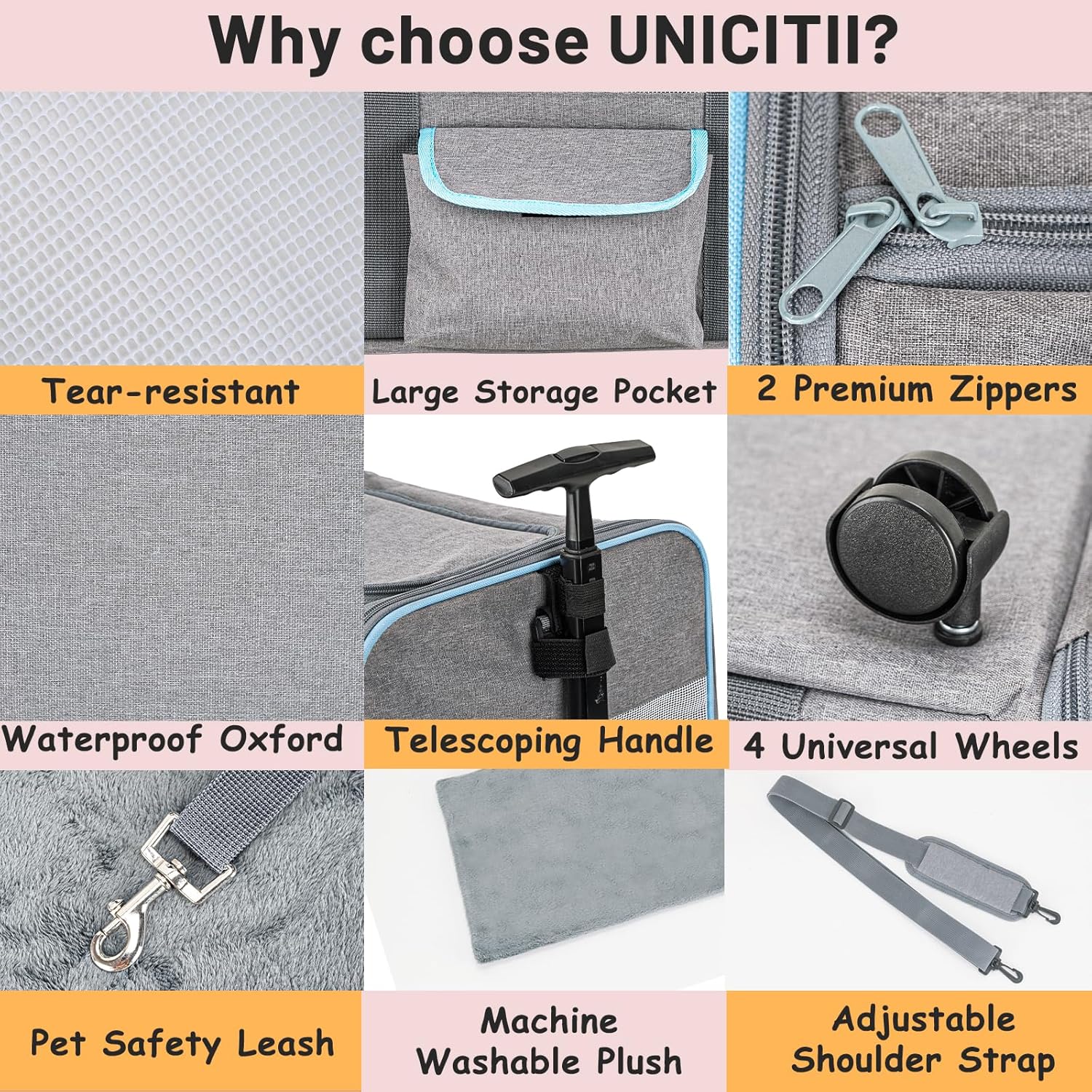 UNICITII Pets Carrier for Small Cat, Dog Medium Cats Puppies up to 20 Lbs, Airline Approved Carrier Soft Sided, Collapsible Travel Puppy Carrier (Grey-with Wheels)