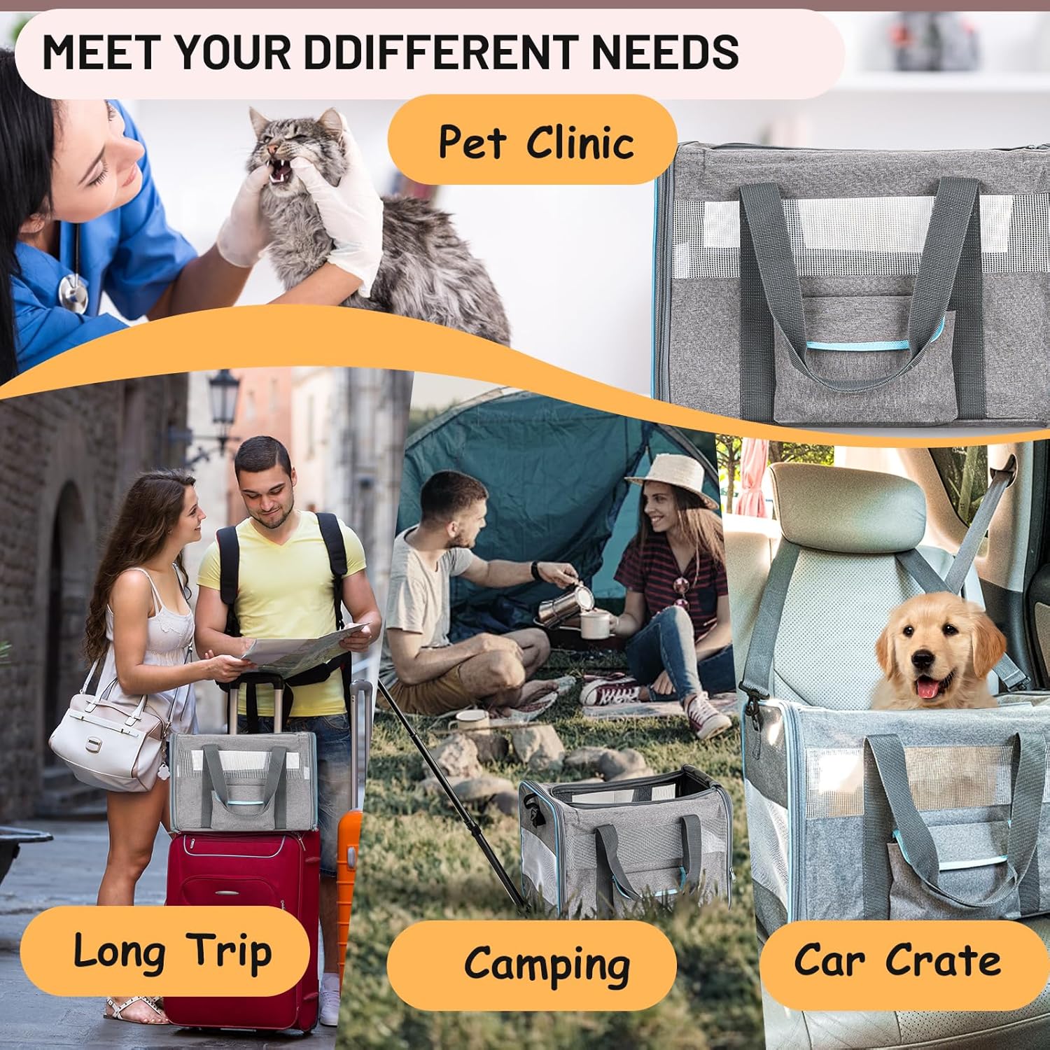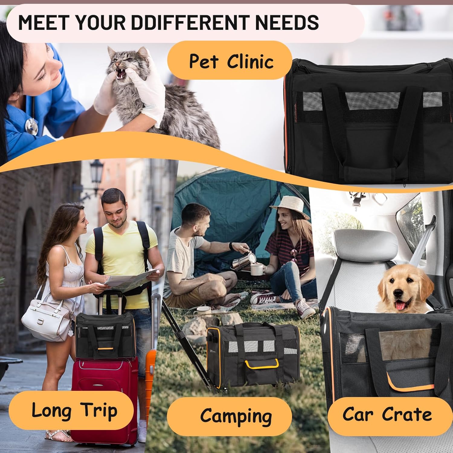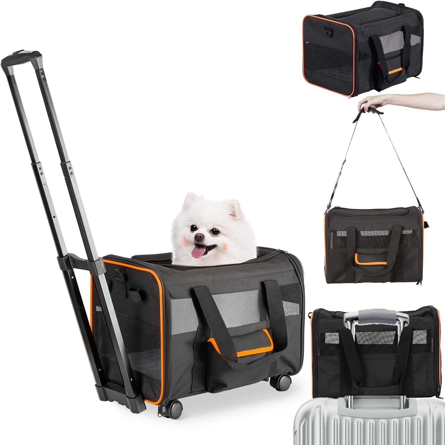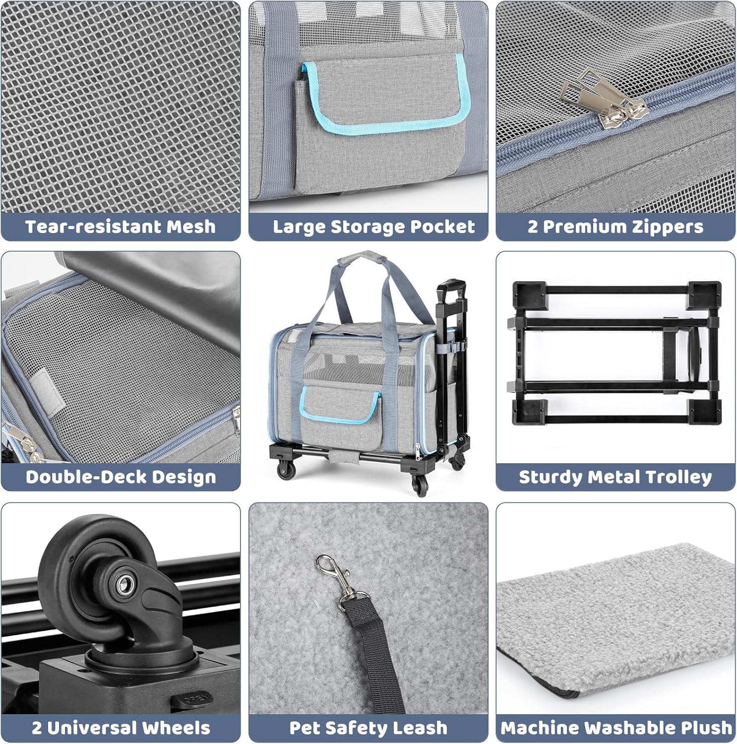 UNICITII Pets Carrier for Small Cat, Dog Medium Cats Puppies up to 20 Lbs, Airline Approved Carrier Soft Sided, Collapsible Travel Puppy Carrier (Grey-with Wheels)