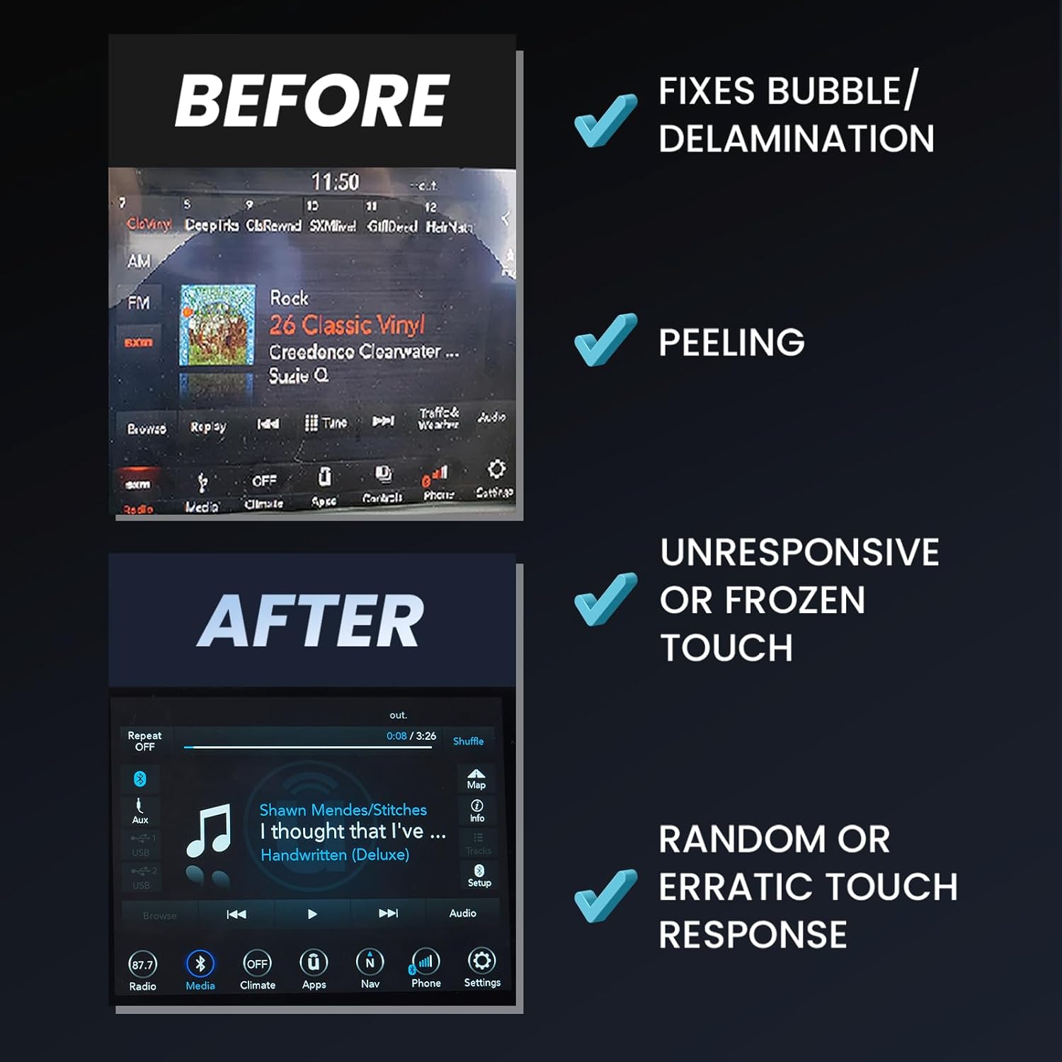 - Upgraded Replacement Gel-Free :It features a gel-free upgrade design between the touchscreen and digitizer, eliminating the common problem of vehicle failures due to high temperatures, thus extending service life. The upgraded screen is also anti-reflective, ensuring clear visibility even in sunlight conditions.