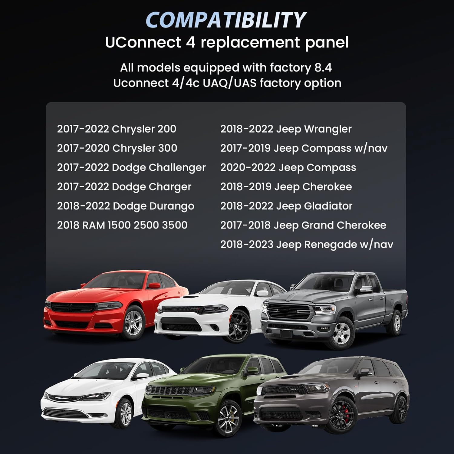 - Vehicle Compatibility : Compatible with Chrysler 200(2017-2022) 300(2017-2020); Compatible with 2018 Dodge RAM 1500 2500 3500 Chassis Cab (2018-2020), Challenger (2017-2022), Durango (2018-2022), Charger (2017-2022); Compatible with Jeep Grand Cherokee Summit Limited Trailhawk SRT, Cherokee (2018-2019), Wrangler (2018-2022), Compass (2020-2022), Compass w/nav(2017-2019), Gladiator (2018-2022), Renegade w/nav(2018-2023) No instruction included, we recommend ask professional for help.
