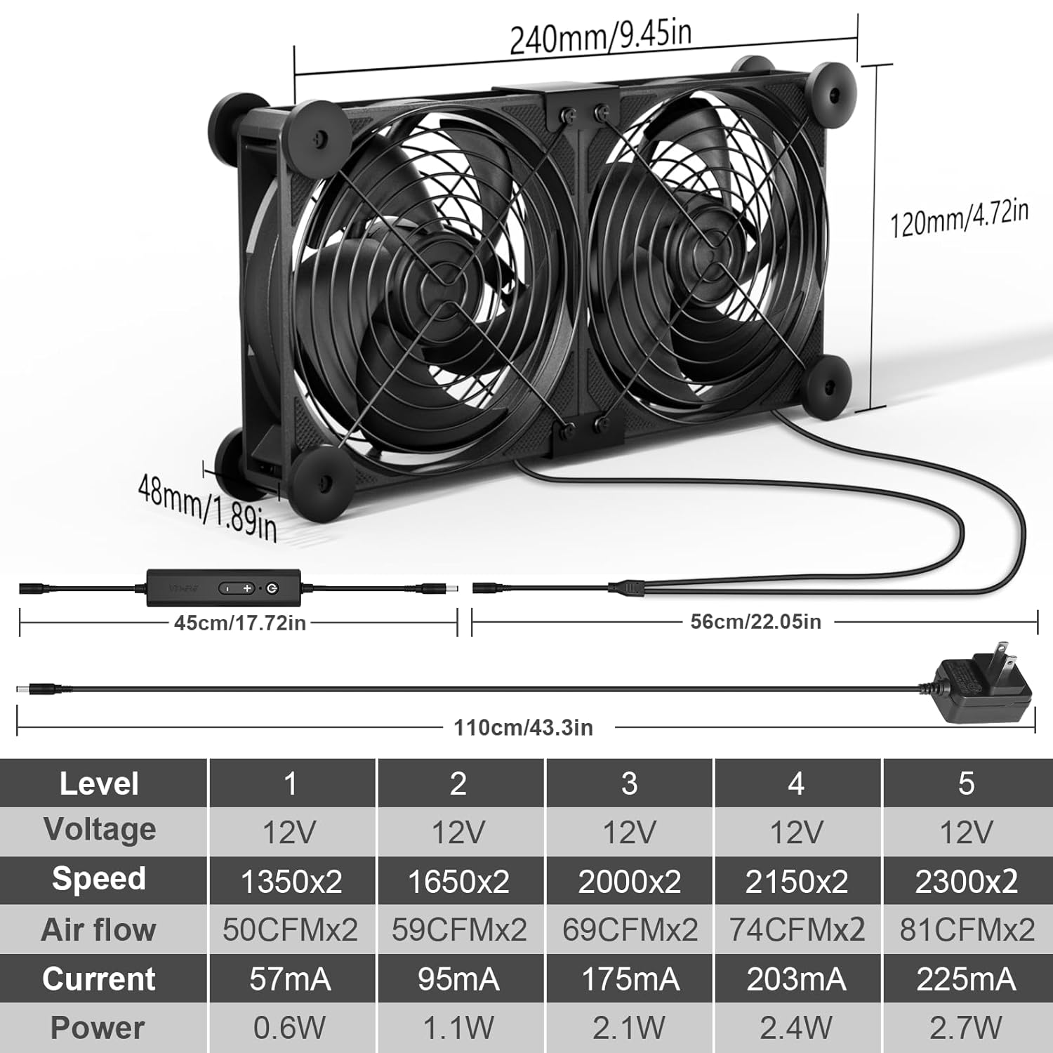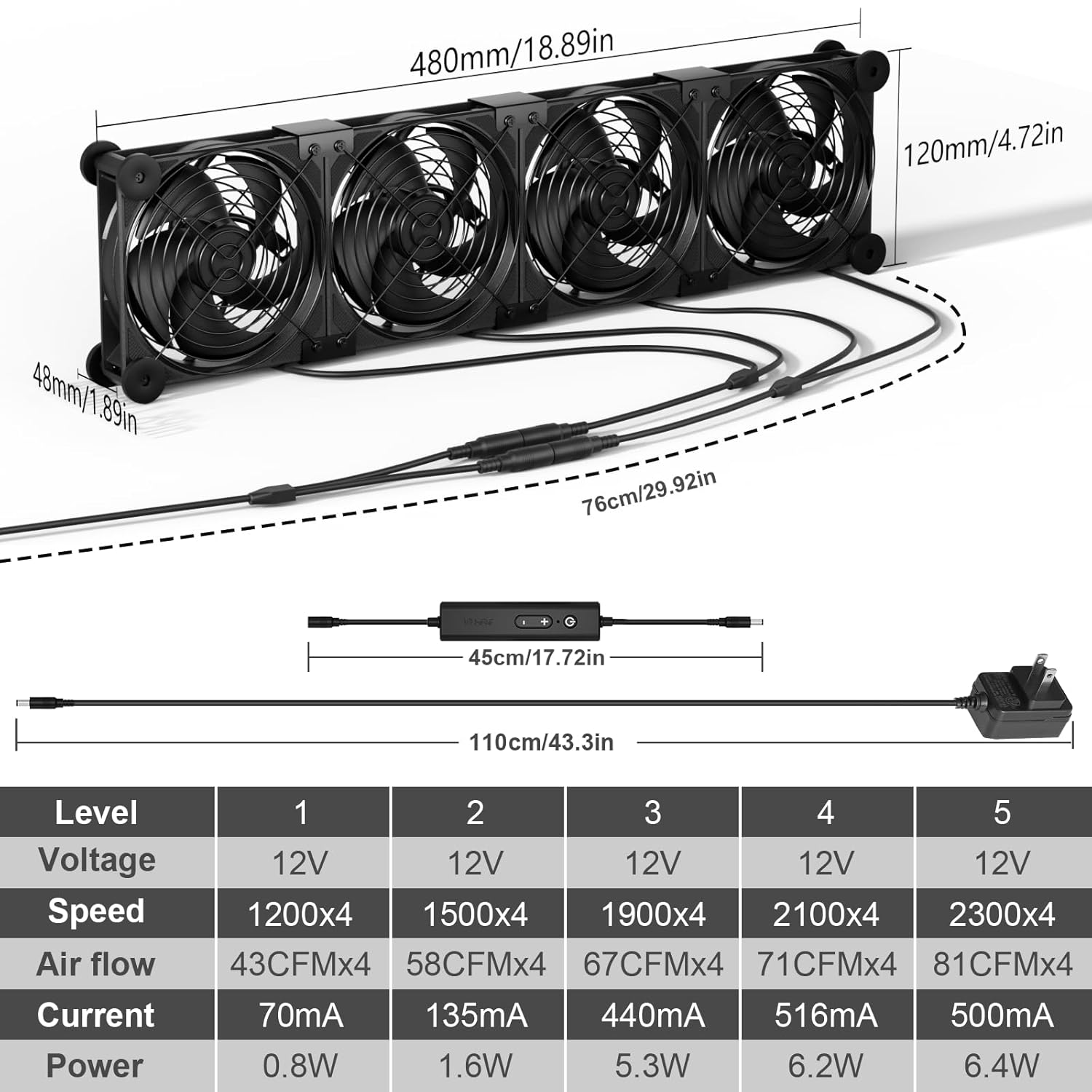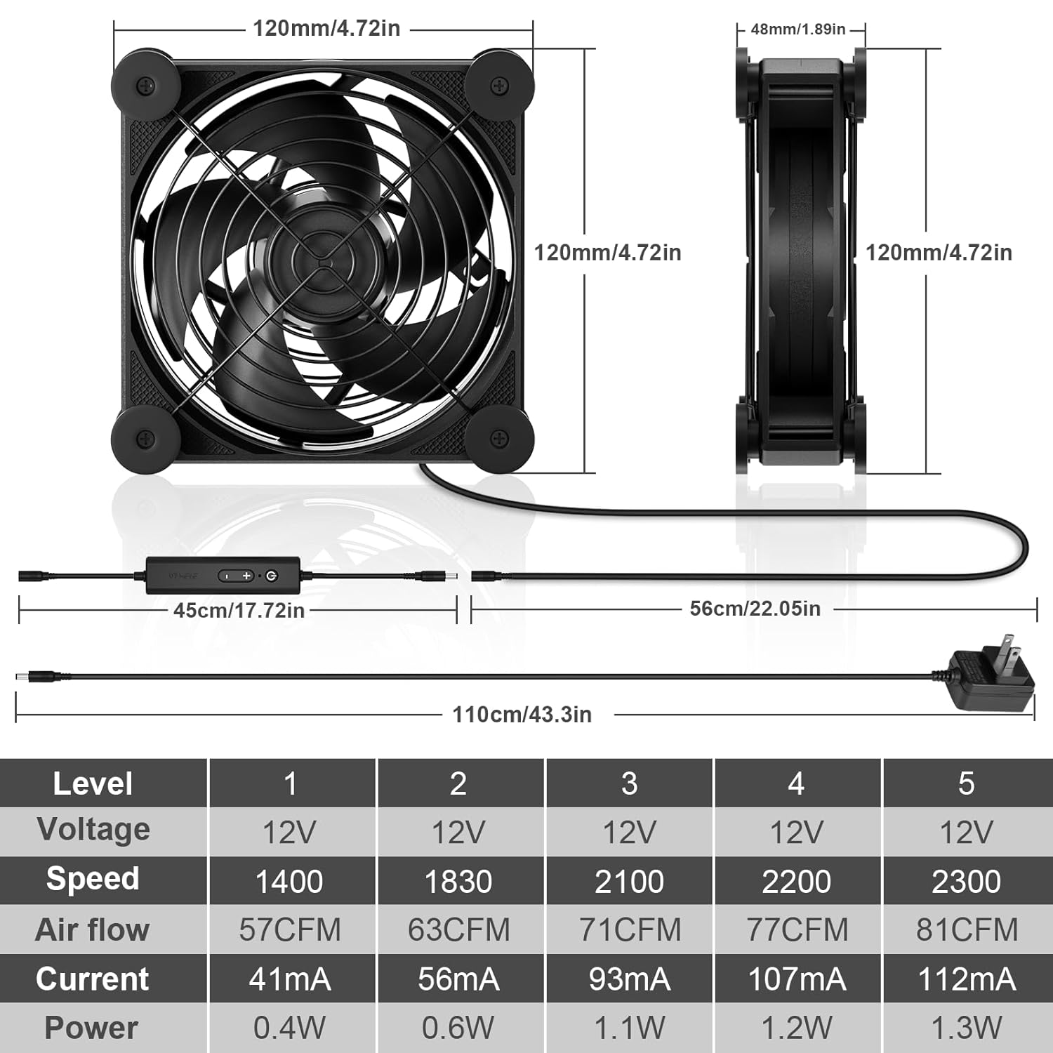【120mm Adjustable Speed Fan】This 120mm fan, powered by a 12V DC supply, effortlessly combines efficient cooling performance with quiet operation. Its five adjustable speed settings cater to your specific airflow needs and comfort requirements seamlessly.