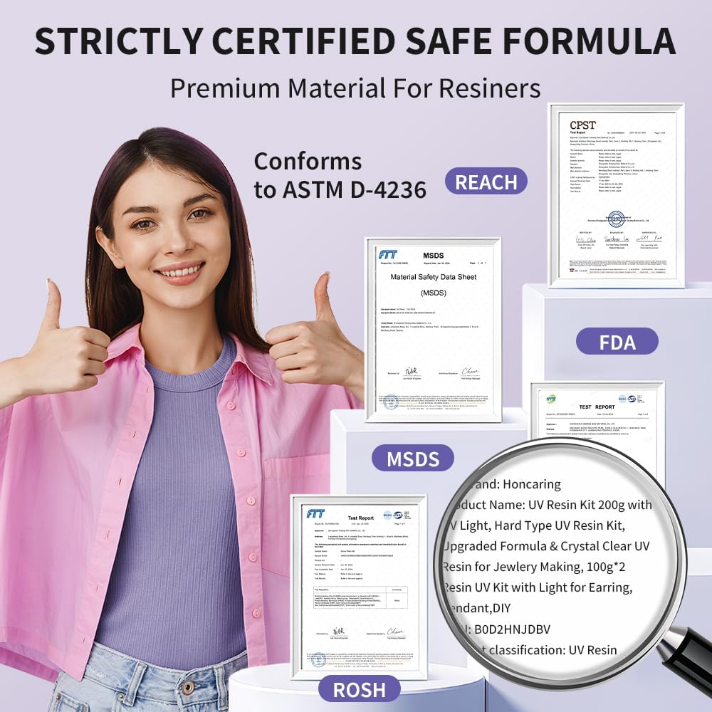 Friendly Beginners UV Resin Kit: Honcaring UV Resin 200g Kit contains UV resin 100g*2, 8W UV resin light*1, silicone cup*2, disposable gloves*2, blue silicone mat*1. Want to get start UV resin art, try our Honcaring UV resin kit