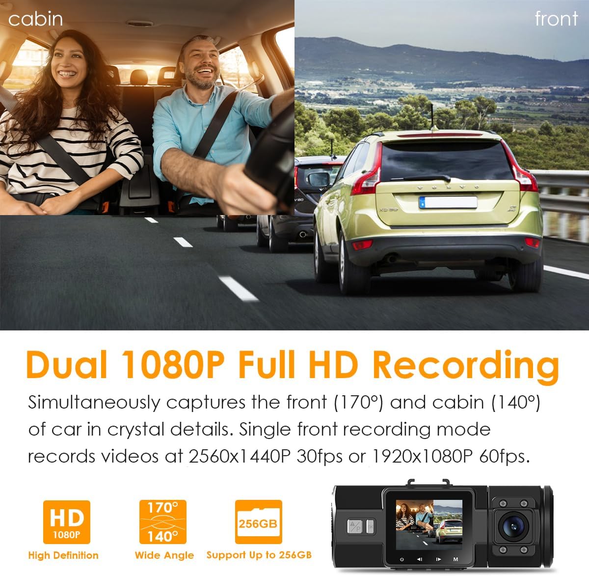 • [ Front and Inside Dual 1080P Dash Cam ] The dual 1080P dash cam simultaneously captures the road front (170°) and inside the cabin (140°) in crystal details at dual 1920x1080P 30fps. It's your superior choice for Lyft, Taxi, Rideshare, and must-have for family road trip!