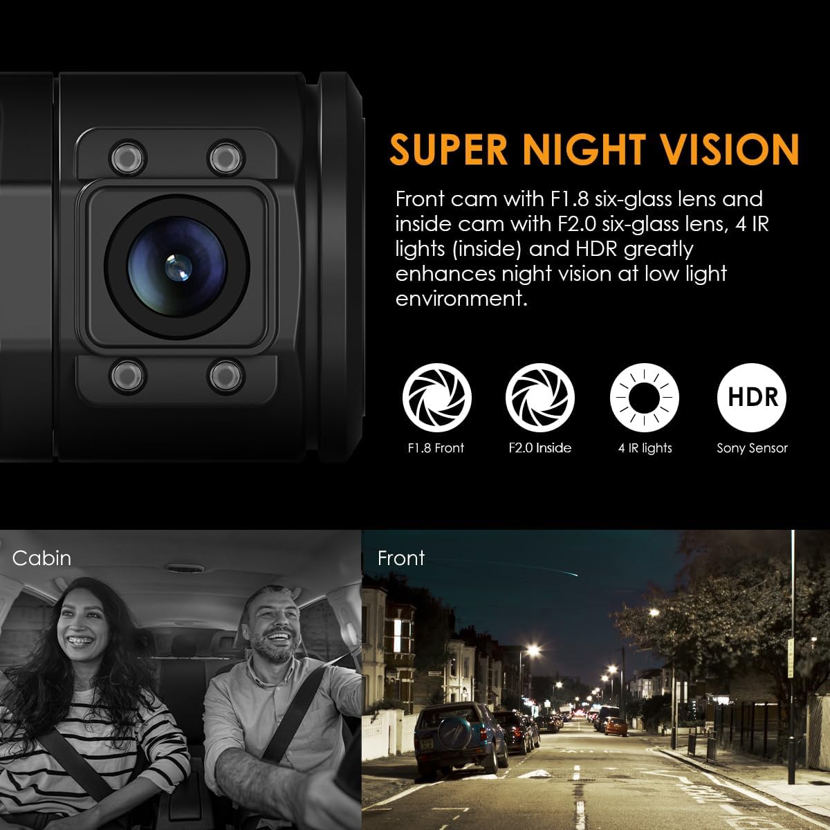 • [ Infrared Night Vision Interior Car Dash Camera for Drivers ] Advanced sony sensor, F2.0 6-glass lens interior facing cam plus 4 IR LED lights greatly enhances night vision inside car at low light environment, making your driving more safer at night. F1.8 6-glass lens front facing cam and unique HDR video system automatically balance the light and dark areas of the video. Simply toggle the night vision modes by short pressing the power button of the car dash camera.