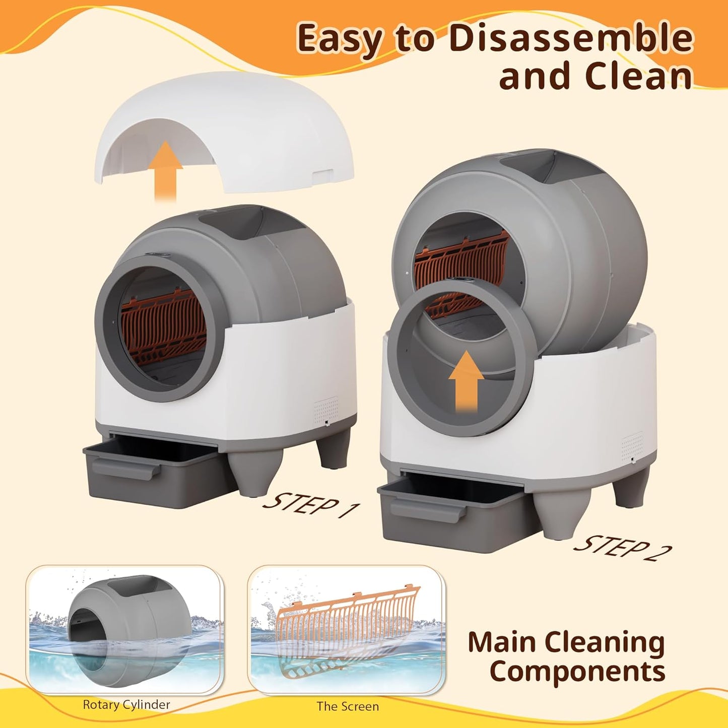 - Spacious and Convenient: Our self-cleaning litter box has a large 90L capacity for cats weighing between 2.2 and 24.2 LBS. Designed for ease of use, this litter box is easily removable for quick cleaning. Simply empty the litter, rinse with a water gun and make sure the bottom is dry. The large capacity litter box ensures up to 10 days of use for your cat and is perfect for use on the go or when traveling