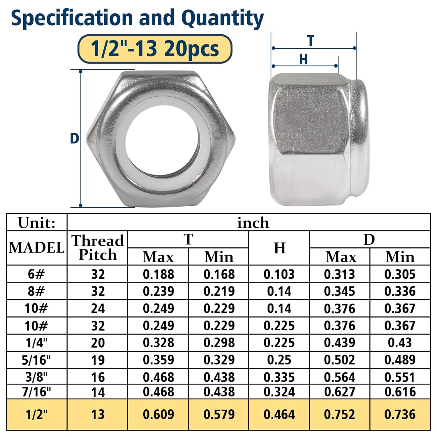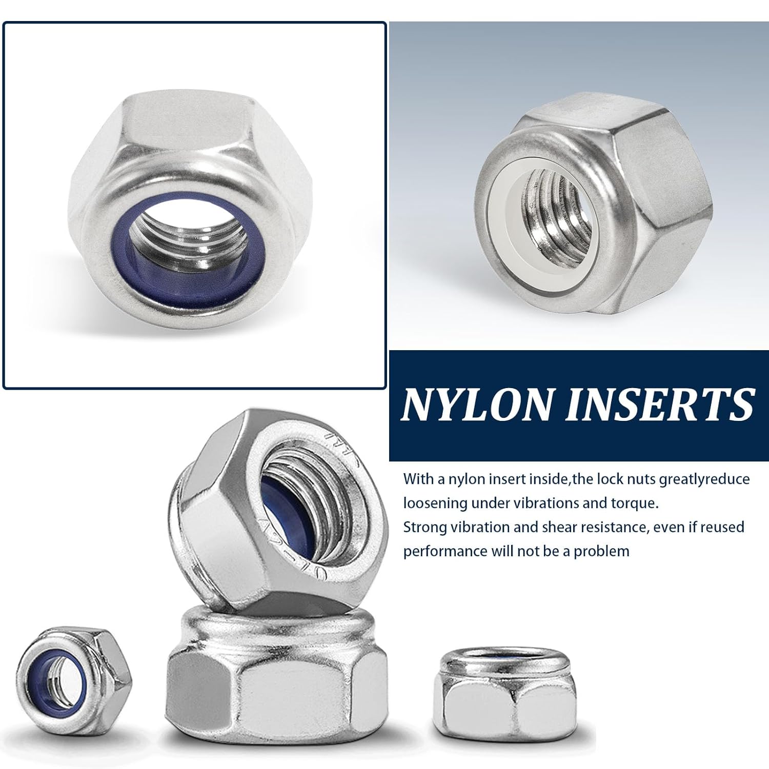 【Nylon Insert Locknut】1/4"-20 is standard inch threaded nylon locknuts have reliable anti-loosening performance, so that it and the bolt threads to form a close fit, and in the role of the elasticity of the nylon friction resistance, in order to achieve the purpose of anti-loosening. Assembly torque is more stable, anti-loosening is very reliable, can be used in shock vibration occasions.