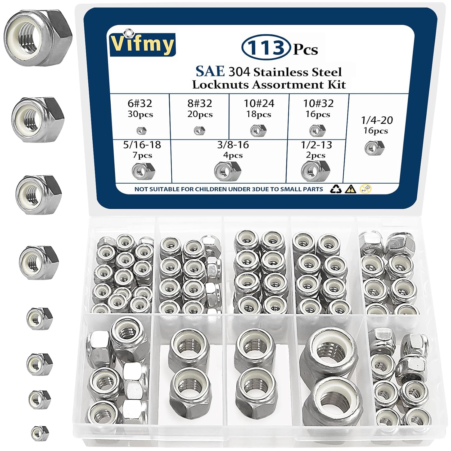 Vifmy 110 Pack 1/4"-20 Inch Lock Nuts,304 (A2-70) Stainless Steel Nylon Insert Locknuts,Standard Inch Thread Nylock Nuts for Bolts