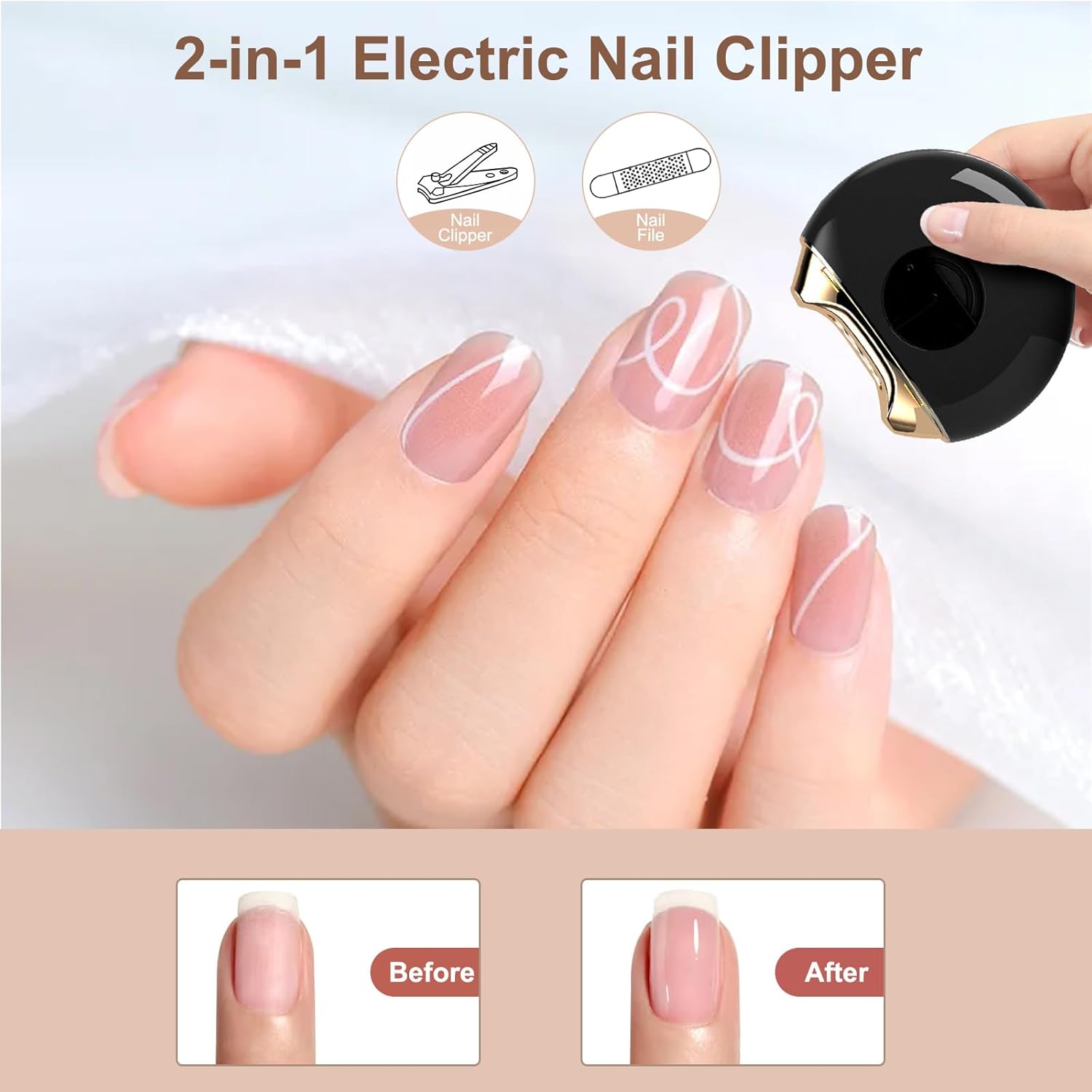 【Multi Functional】This electric nail clipper combines the functions of nail file, nail cutter, nail scissors and nail trimmer, not only can it trim your nails, it also has a built-in nail polishing function, which can replace nail clipper set or nail art set.