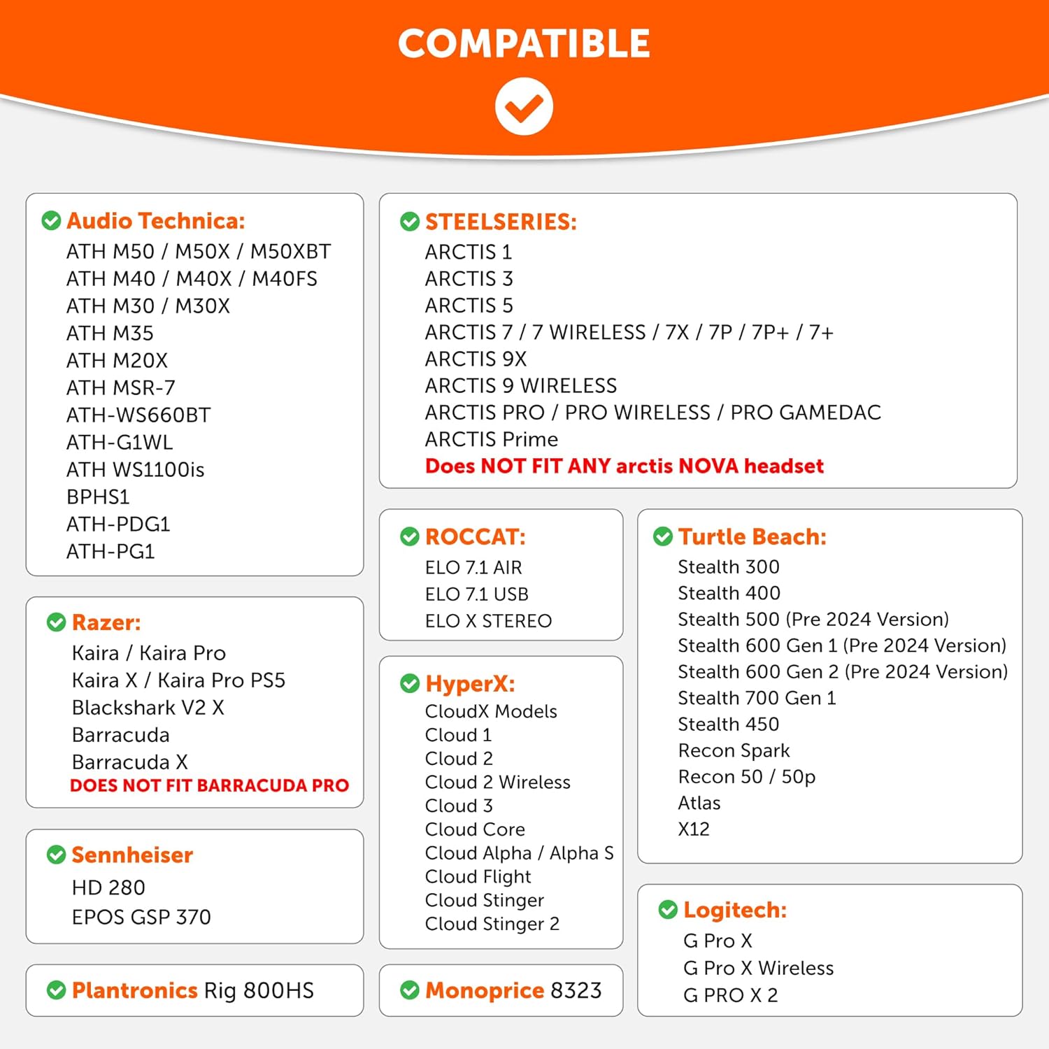 Compatible Devices Audio Technica ATH Series, HyperX Cloud Series, SteelSeries Arctis Series, Turtle Beach Stealth 600 Gen 1 & 2