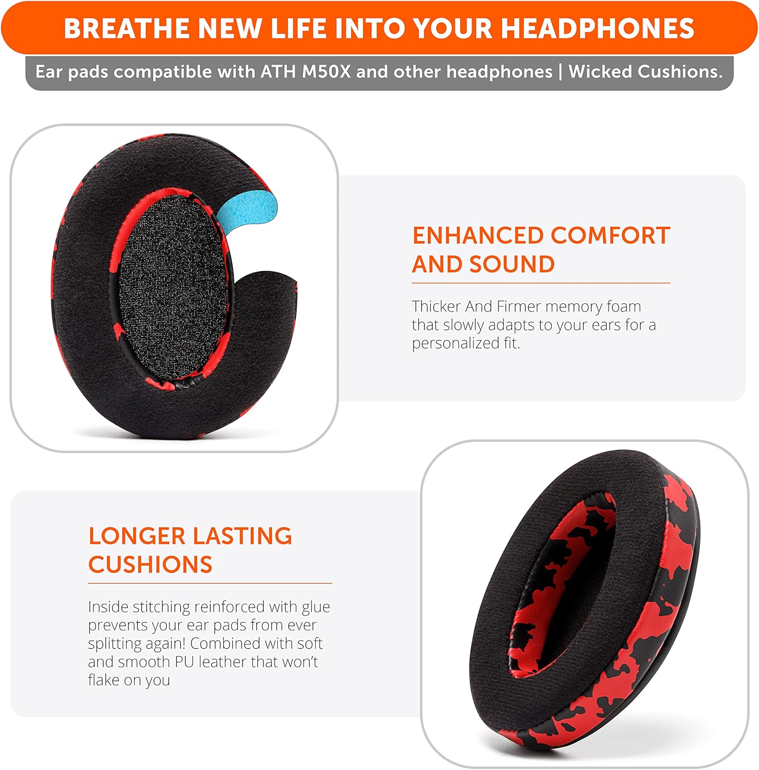 Rugged Durability: These replacement earpads were made to last for longer… We added stitching and reinforced it with glue on the inside seam to avoid splits and breaks. Extra thickness prevents your ear pads from becoming flat as time goes by.