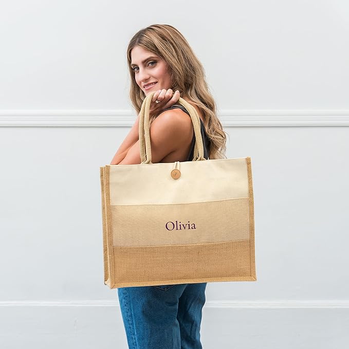 This large, custom personalized rustic looking ombre burlap tote bag is the perfect gift for that natural beauty in your life. Made from sturdy and durable burlap, this plain reusable tote bag stays strong during travel when full of books for school, groceries from the market, gym clothes for after work, or sunblock and a lunch for the beach!