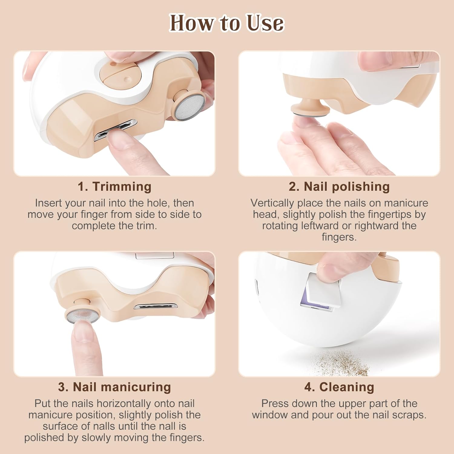 【Low Noise & Portable】--- Our automatic electric nail clipper work with 40 decibel low noise, allowing you to trim your nails in peace, convenient for mom to cut baby's nails in low sound working condition and it will not disturb the baby's rest. The compact design makes it easy to carry, you can put electric nail trimmers in your bag.