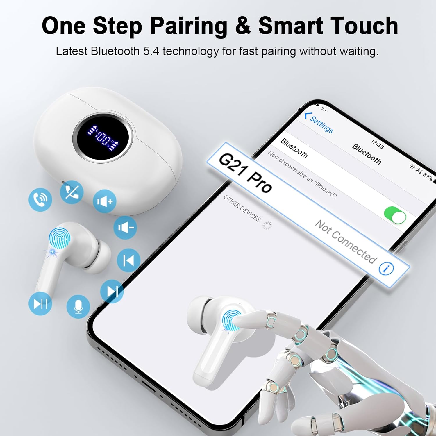 【2025 Upgraded Bluetooth 5.4 with 0.1s Ultra-Low Latency】The Rinsmola G21Pro Bluetooth headphones adds Bluetooth flash pairing technology to the latest Bluetooth version 5.4 for fast pairing in 1 seconds. Compared to the previous version, power consumption is reduced by 40%, signal stability is improved by 60% and interference immunity is increased by 55%. Ensure audio and playback are synchronized for an immersive entertainment experience. After pairing your devices for the first time, your ear buds will automatically connect when you remove them from the charging case.