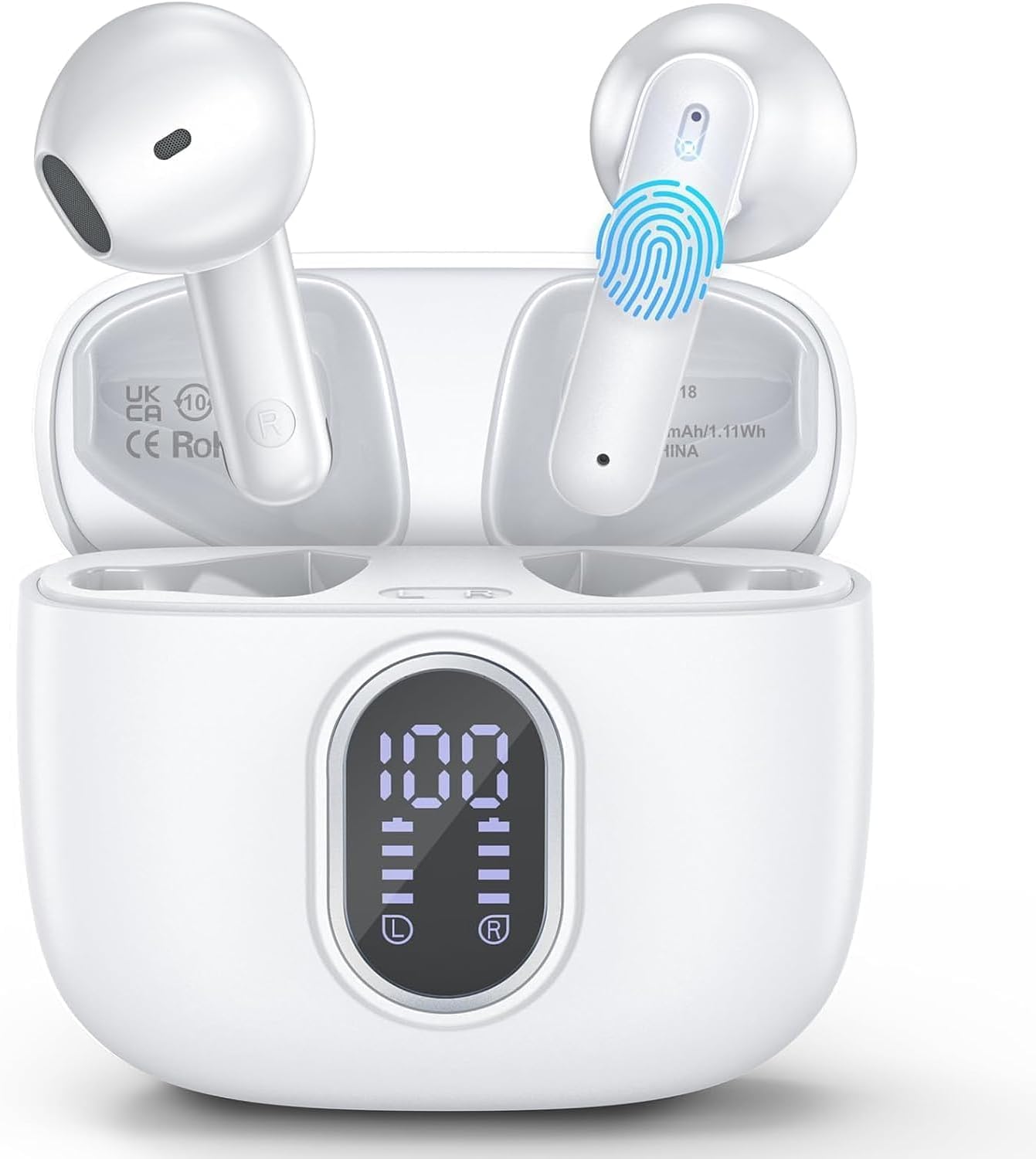 Wireless Earbuds Bluetooth 5.3 Headphones 42 Hrs Playtime with LED Display, Deep Bass Stereo and Noise Cancelling Bluetooth Ear Buds IPX7 Waterproof Wireless Ear Buds with Mic for iPhone Android White