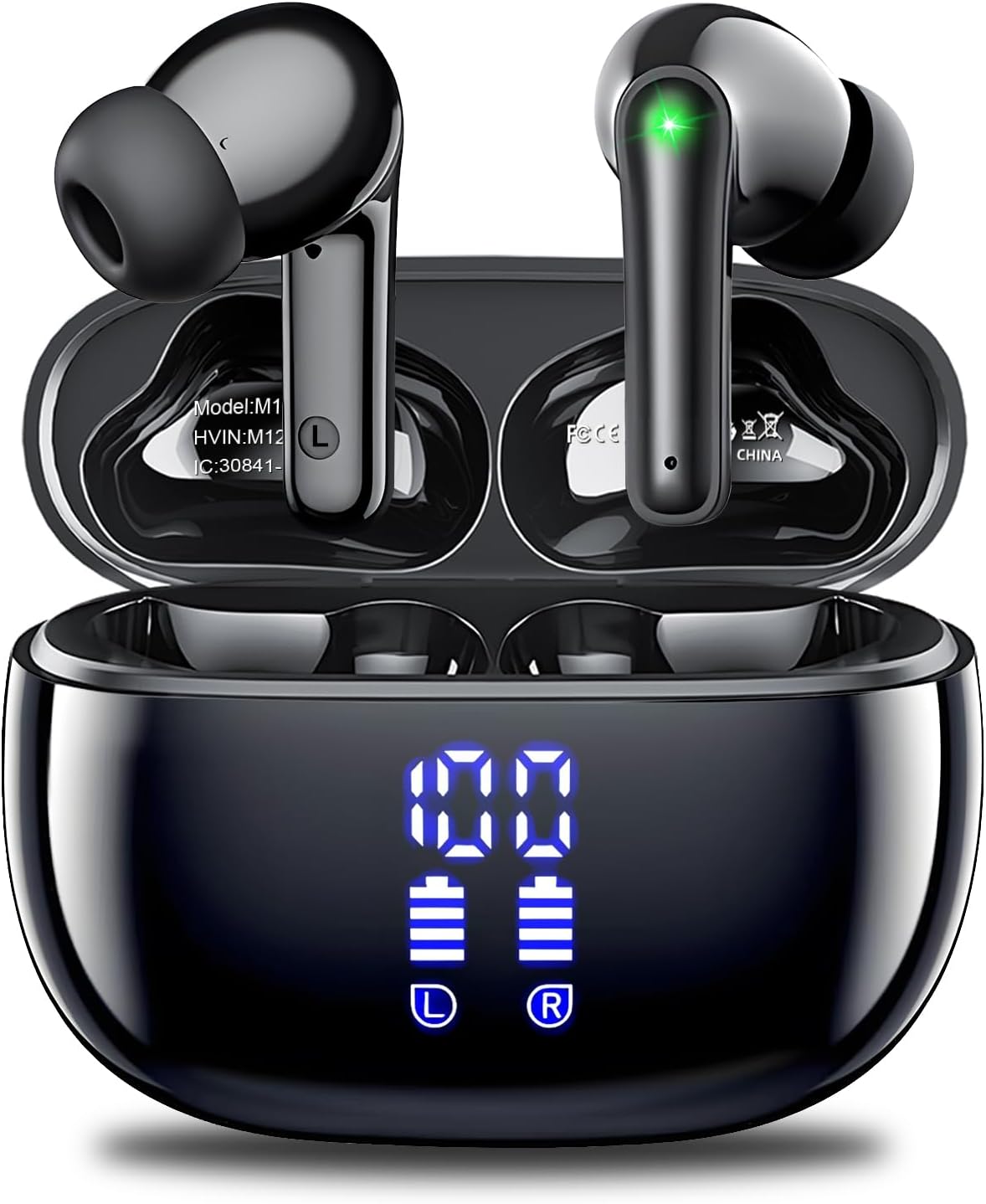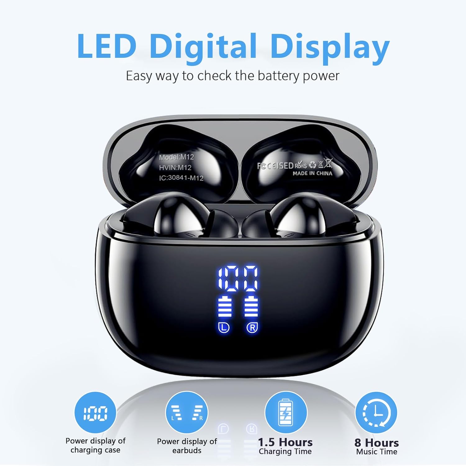 • LED Power Display & 48 Hours Playback:The M12 wireless earbuds can be used for about 8 hours (50%-60% volume) on a single charge, and with the compact charging case allows you to use them for 48 hours continuously. The Type-C charging port provides a faster and more convenient charging experience. The built-in dual LED power display allows you to keep track of the remaining power in the charging case and the charging status of the earbuds in real time.