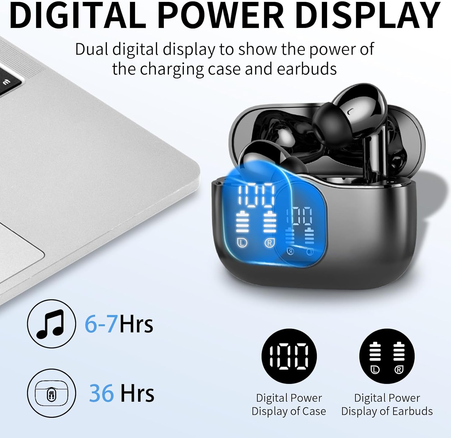 Wireless Earbuds, Bluetooth Headphones 5.3 HiFi Stereo, Wireless Earphones with ENC Noise Cancelling Mic, IP7 Waterproof in Ear Wireless Headphones, LED Digital Display Ear Buds, Touch Control, Black