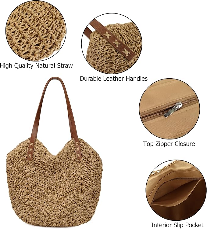 Leather Handles: Securely sewn into the body, the faux leather handles add a touch of luxury and styles to the classic natural straw bag