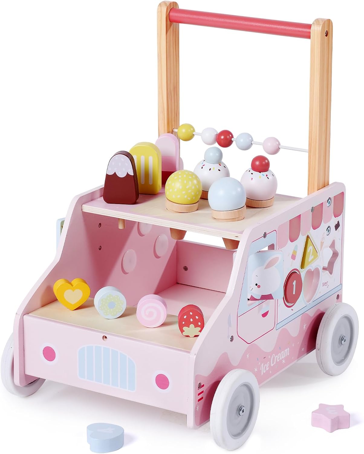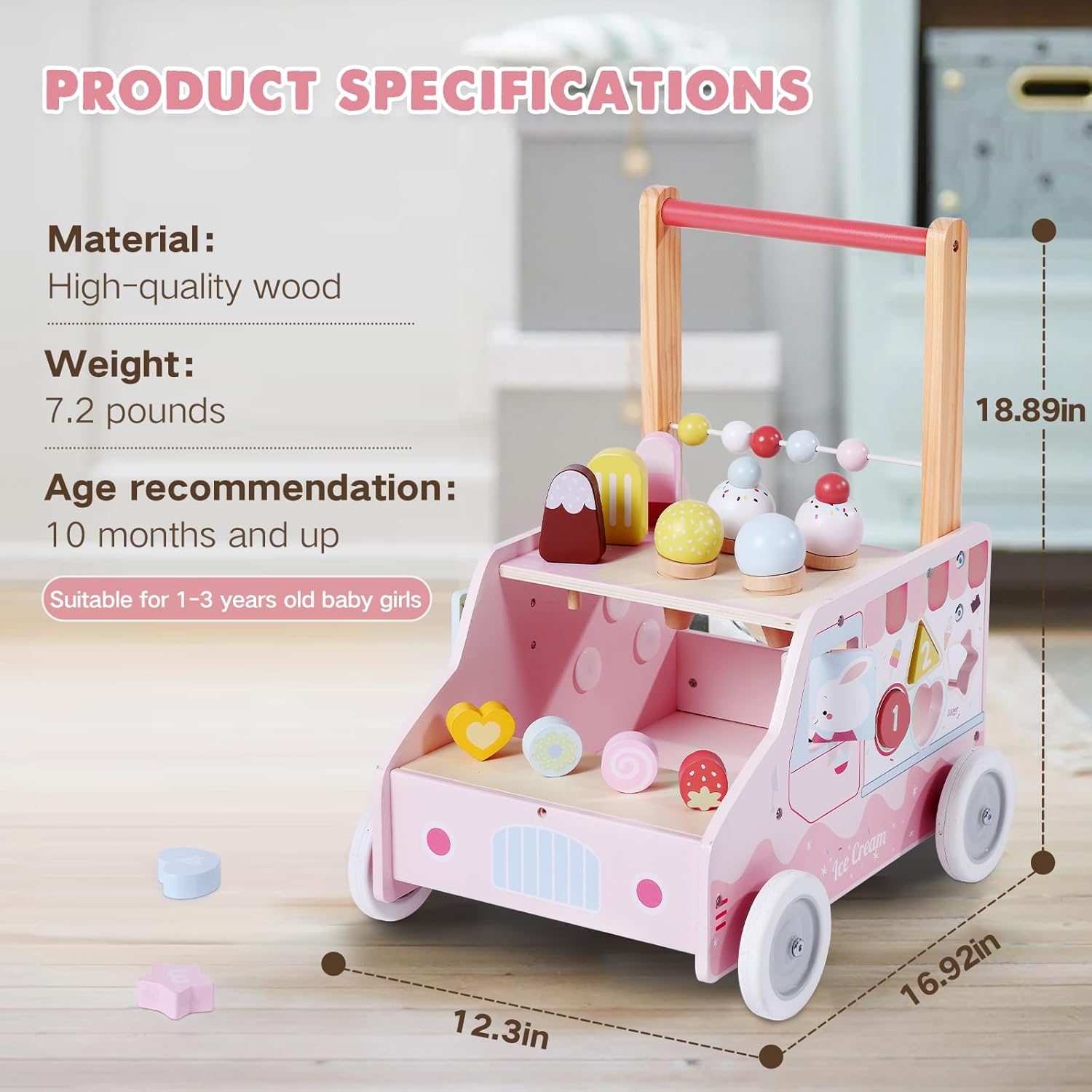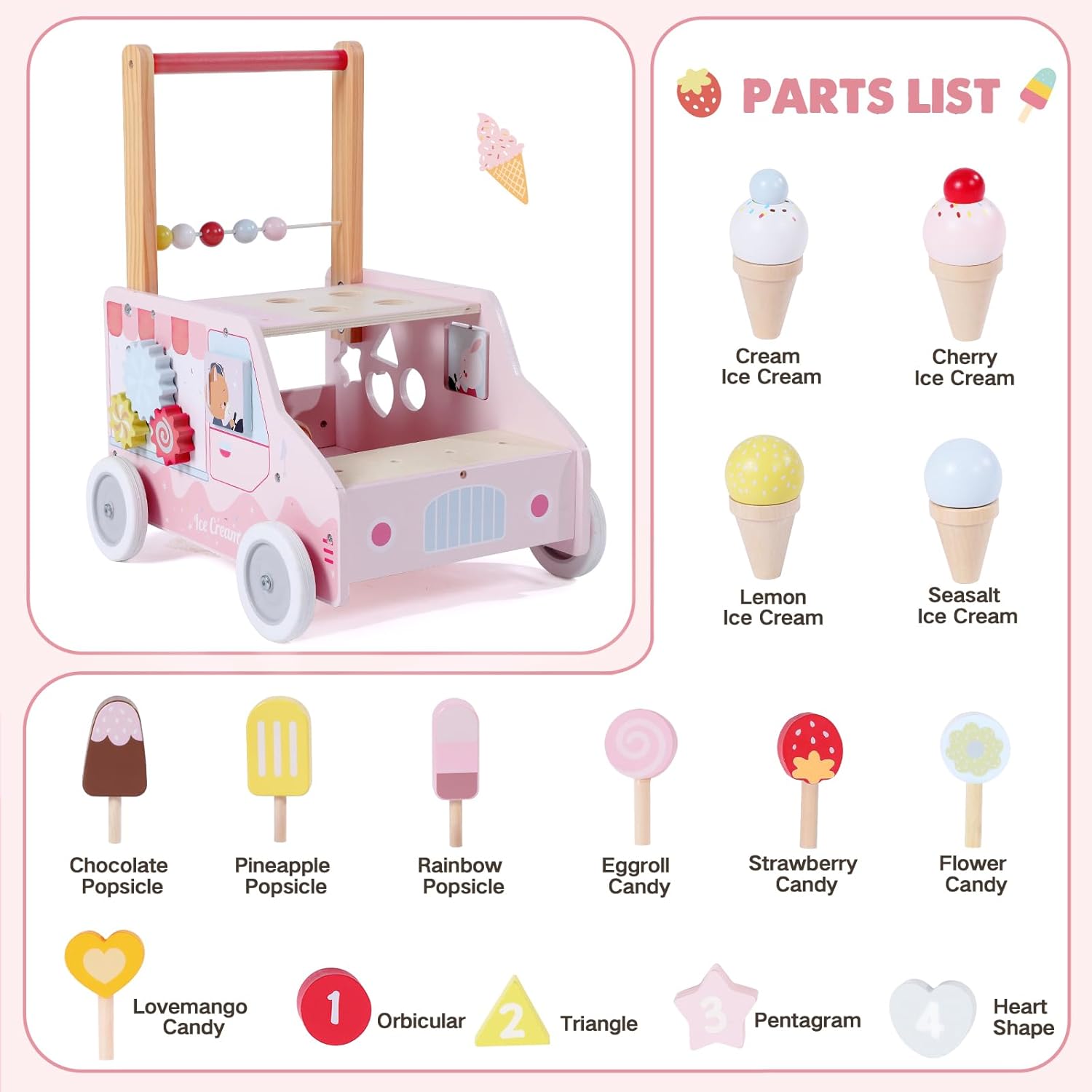 Multi-function In 1 Baby Walker:Wooden Baby Walker-Babies can push this ice cream walker around and learn to stand on their own. The wooden ice cream Activity walker is good for exercising baby's motor skills, balance and fine motor skills. Kids Learning Walking Toys Also available Sit down with ice cream and candy toys to enjoy a fun dessert time and encourage parent-child interaction. Small Toy/Doll Storage Bin/Box-The storage space can easily organise small wooden toys and other little dolls, books, etc.