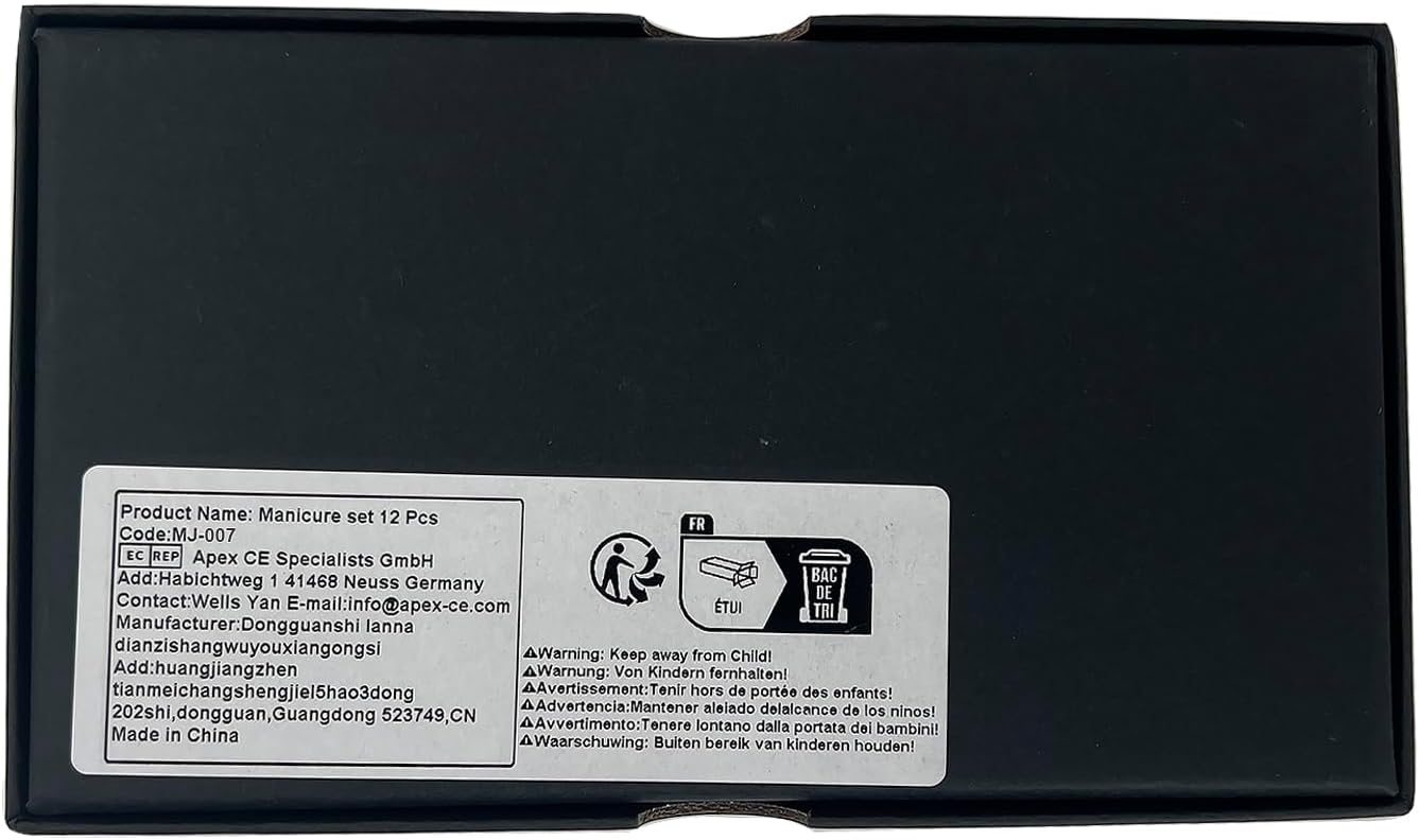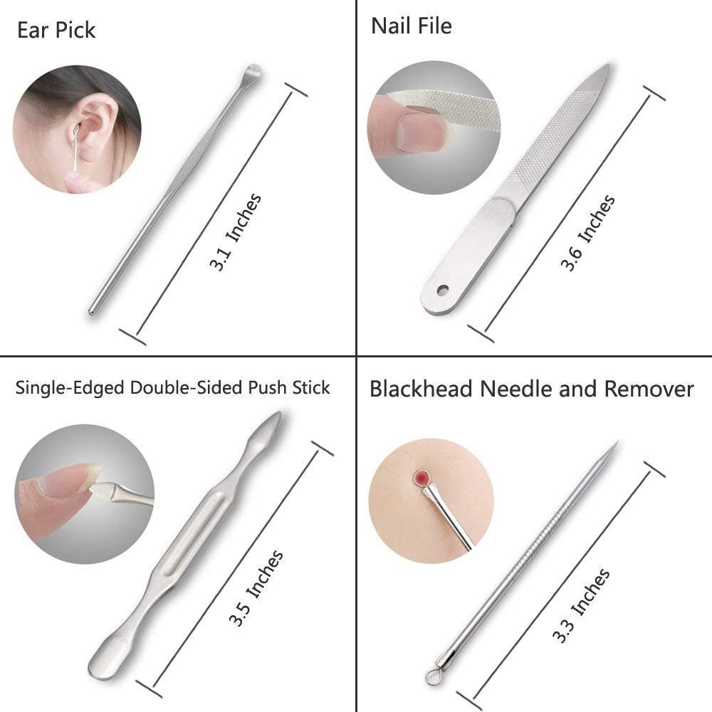 12PCS MANICURE KIT: Includes toenail clipper, nail clipper, diagonal nail clipper, multi-purpose scissor, cuticle trimmer, ear pick, single-edged double-sided push stick, eyebrow tweezer, peeling knife, nail file, blackhead needle and loop remover, V-shaped push Stick.